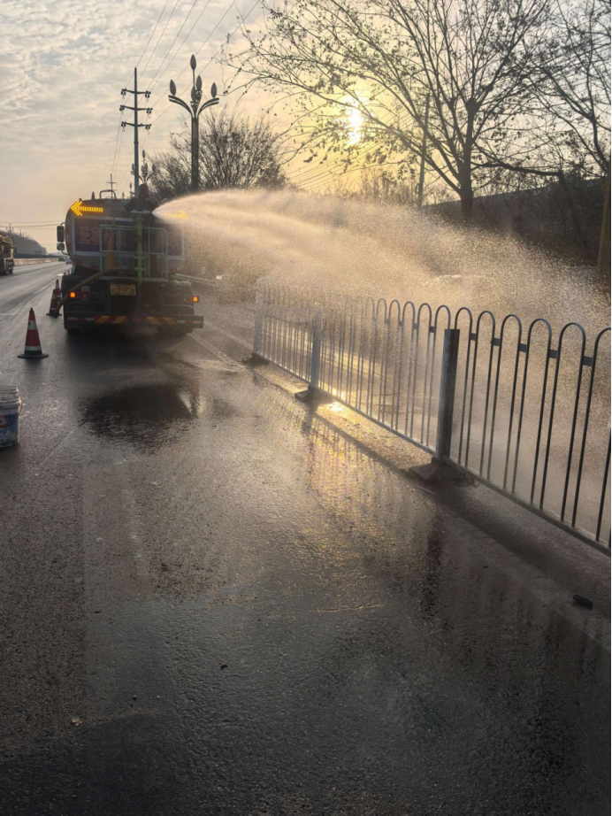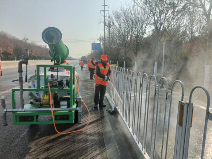 作业期间,养护人员采用机械清洗与人工擦洗相结合的方式,重点对约3公里长的护栏进行了彻底清洗,累计投入4辆水车、20人次。同时,对约300米受损护栏进行了修复与更新,出动工程车辆3辆,投入人工15人次。现场作业规范,养护人员身着安全服,并规范设置施工警示标志,确保了作业安全与道路通行有序。