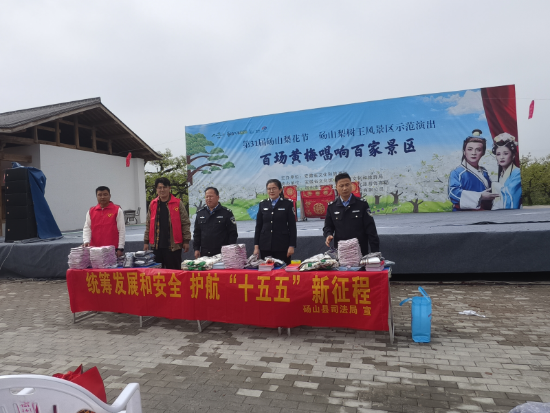 近日,梨树王景区“百场黄梅唱响百家景区”戏曲非遗文化惠民演出如火如荼地进行,砀山县司法局普法志愿者走进景区,将法治宣传融入春日文化盛宴之中,在梨园为群众送上一堂别开生面的法治教育课。