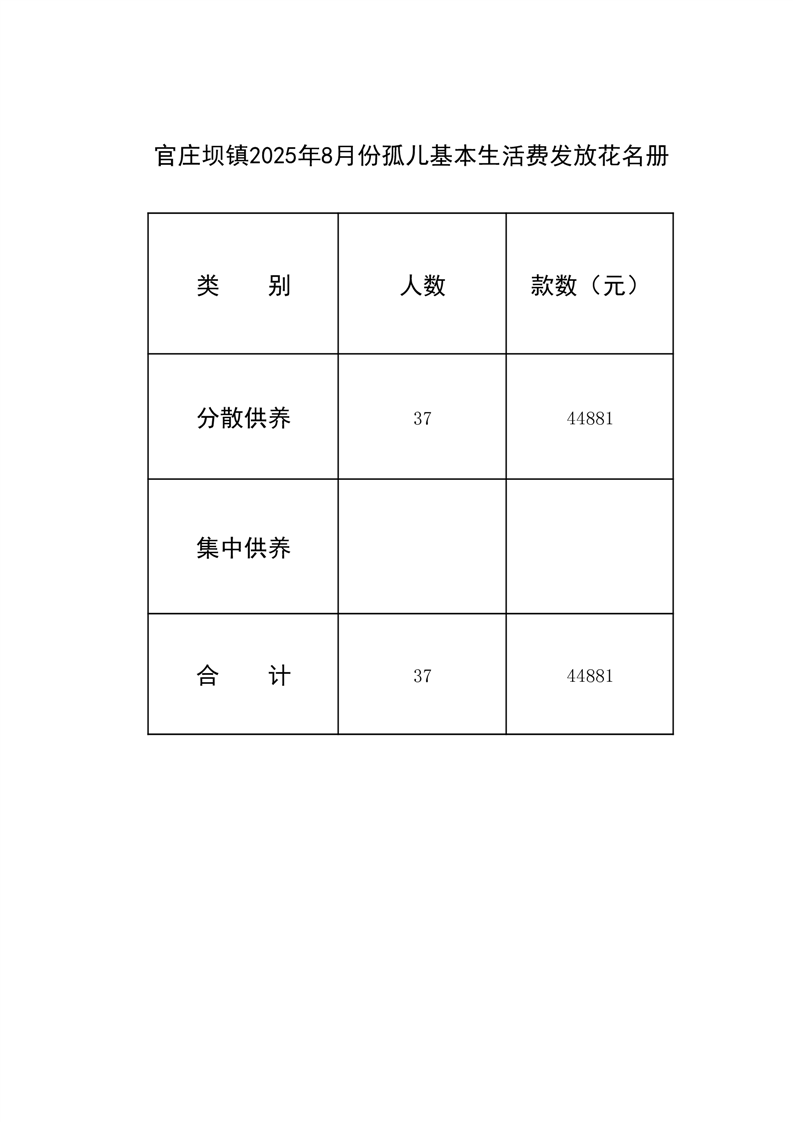 官庄坝镇2025年8月份孤儿基本生活保障资金分配结果