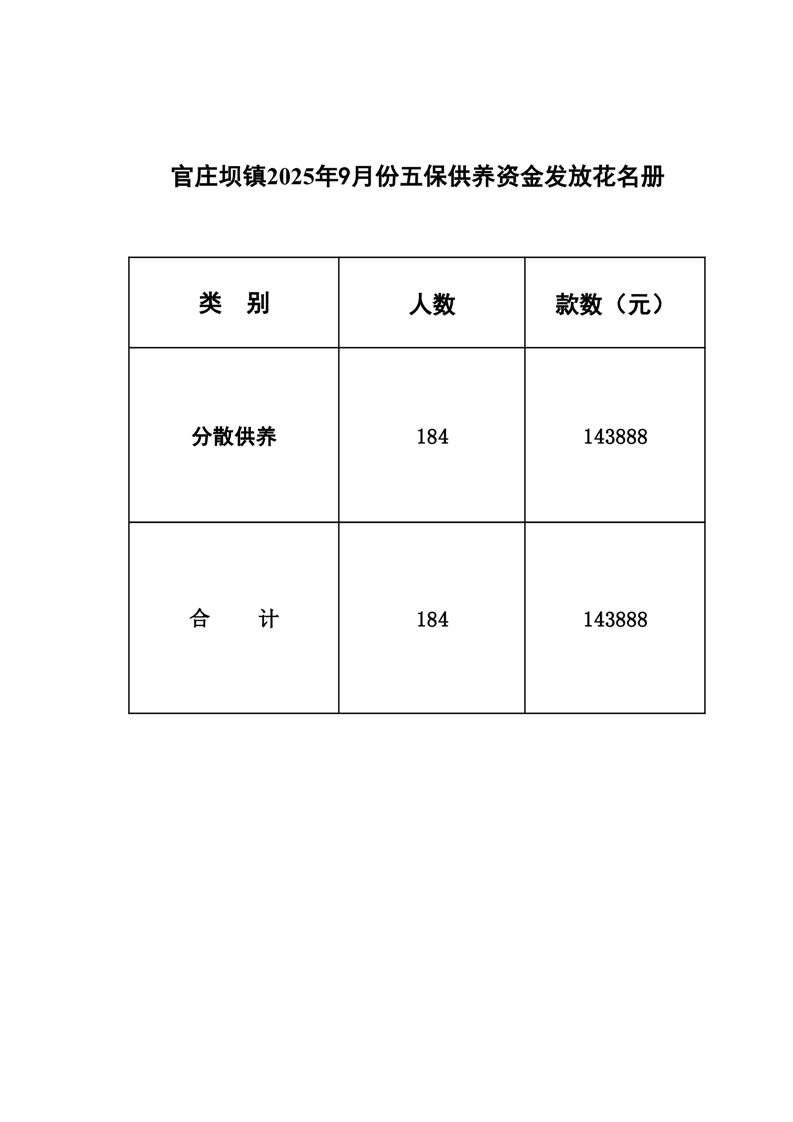 官庄坝镇2025年9月份分散供养特困人员资金发放花名册