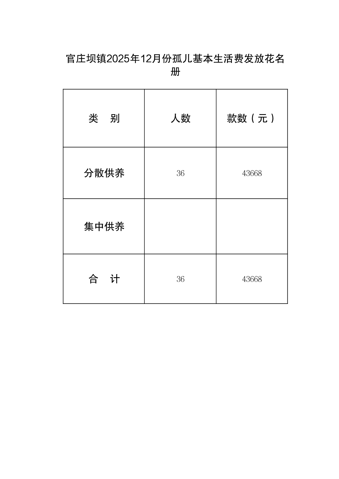 官庄坝镇2025年12月份孤儿基本生活保障资金分配结果