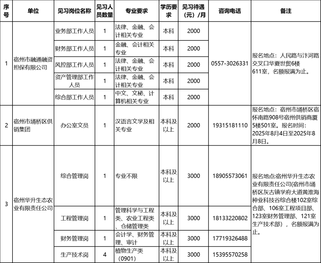 为贯彻《宿州市就业见习管理办法》精神,结合目前工作需要,现以下公司计划公开招聘见习人员21名,就业见习对象为2024届、2025届未就业高校毕业生,具体岗位信息详见下表。