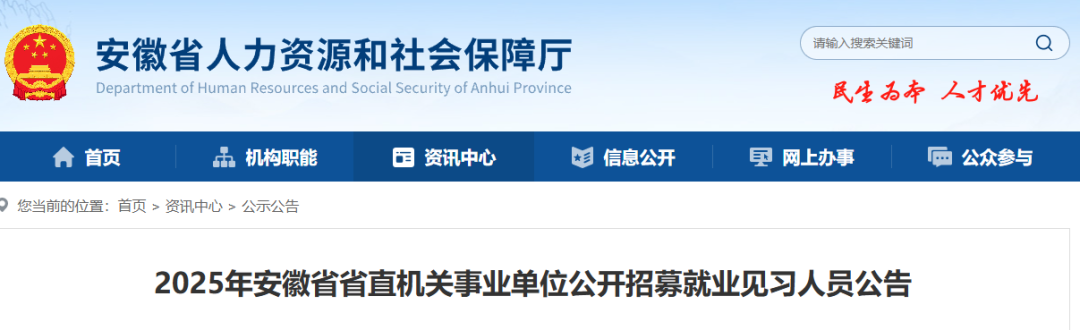 经岗位征集审核,2025年在省直及中央驻皖有关党政机关和参公管理、公益一类事业单位开发462个就业见习岗位(详见附件),招募就业见习岗位等信息于本公告发布之日起在安徽省人力资源和社会保障厅网(hrss.ah.gov.cn)、安徽公共招聘网(www.ahggzp.gov.cn)统一发布。