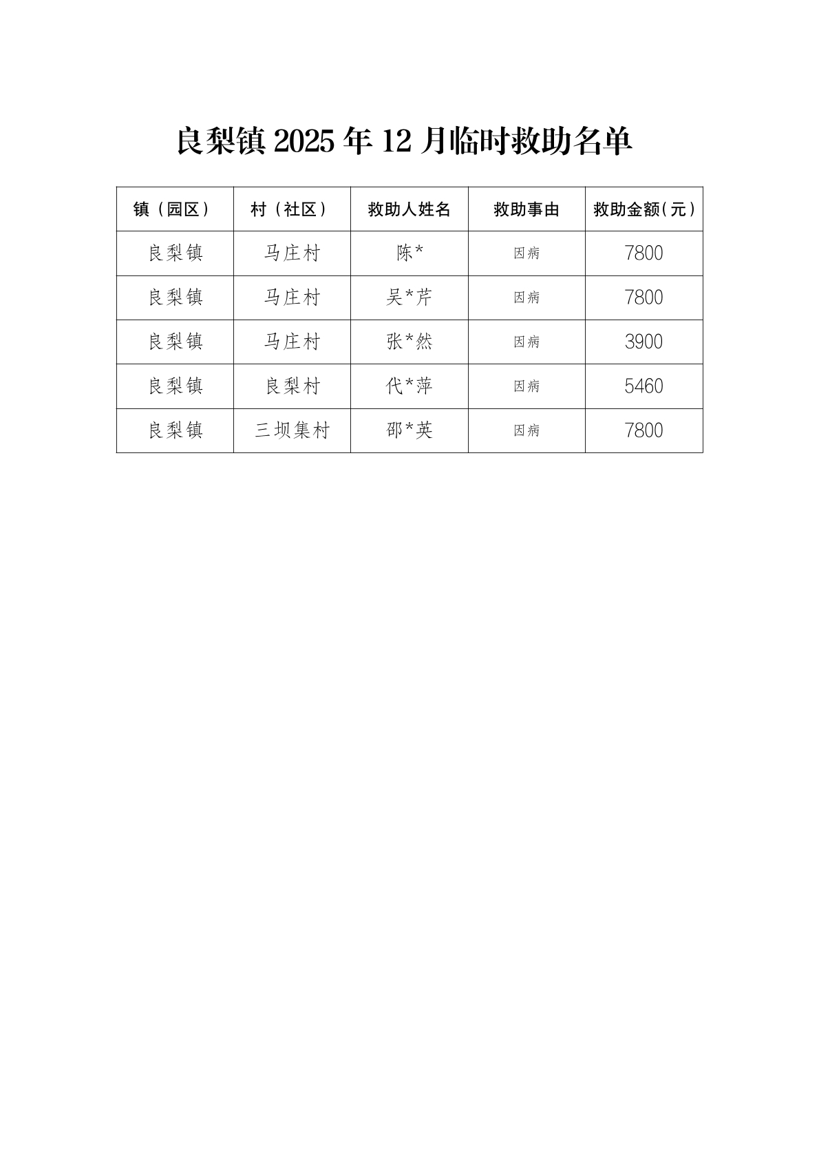 良梨镇2025年12月临时救助名单