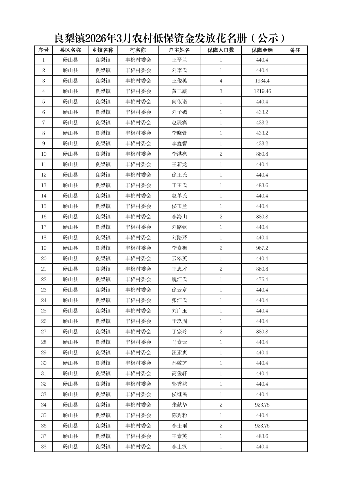 良梨镇2026年3月农村低保资金发放花名册(公示)