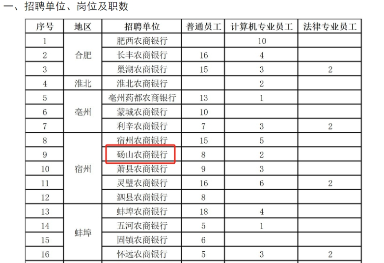 2月14日,安徽省农村信用社联合社发布《安徽农村商业银行系统2025年社会招聘公告》,其中,砀山农商银行招聘10人。
