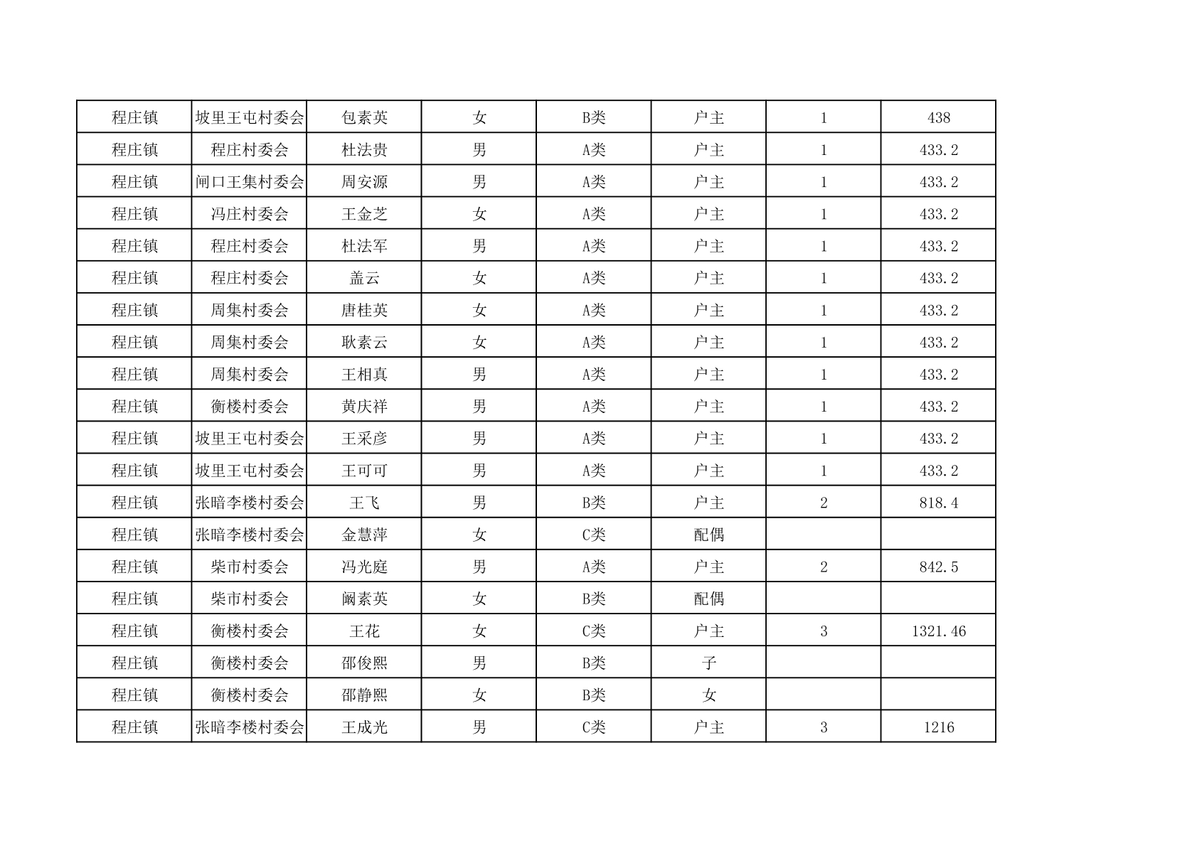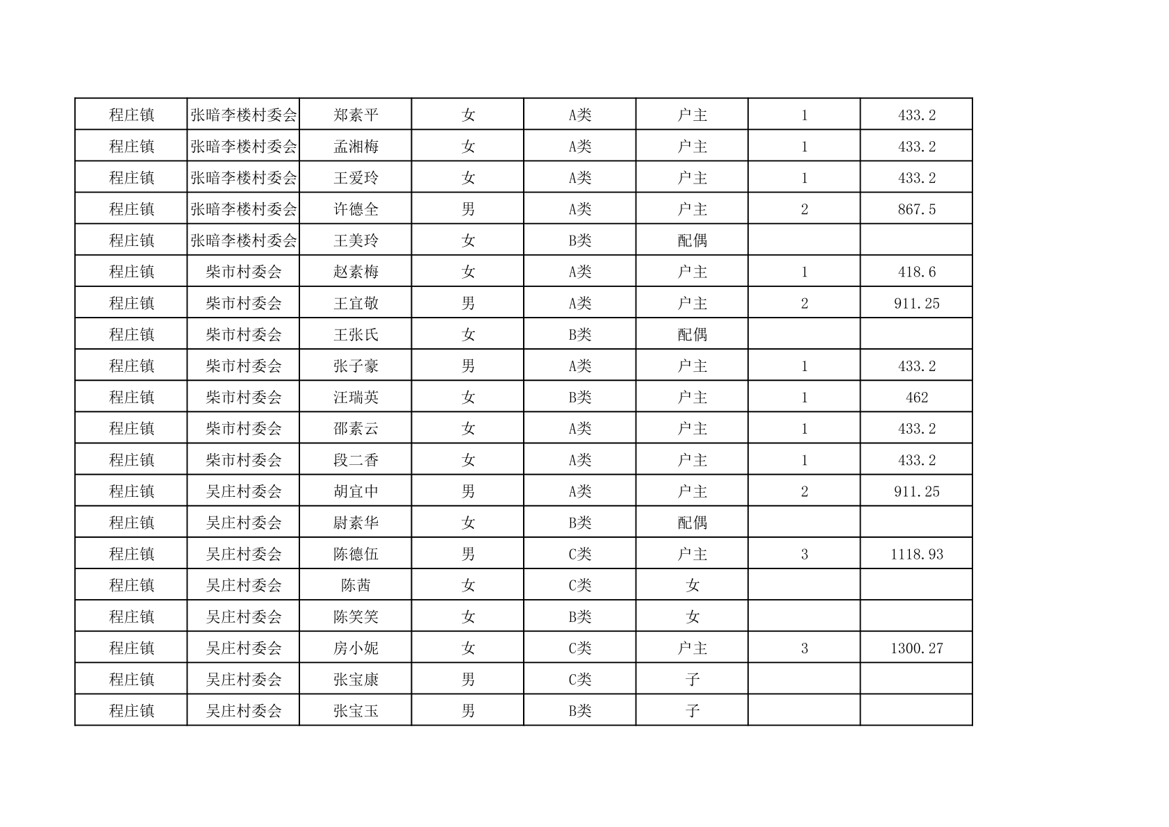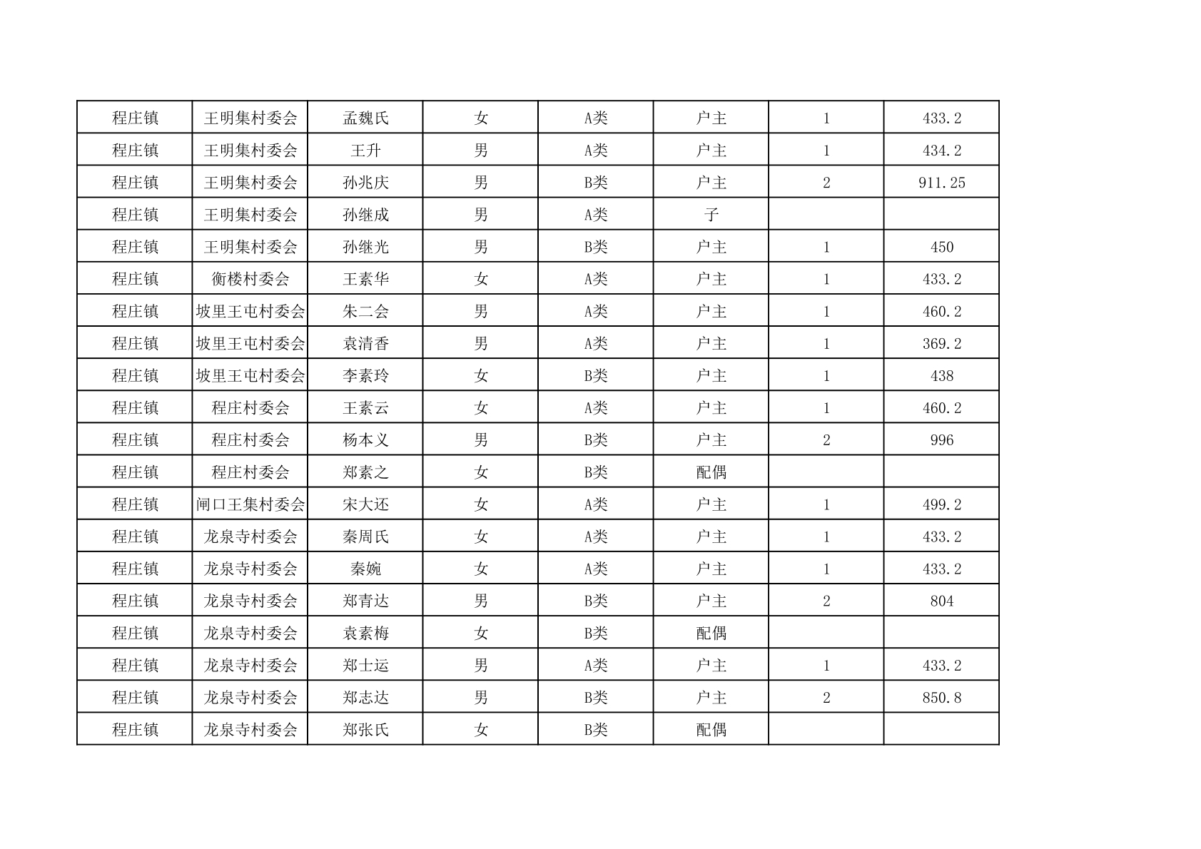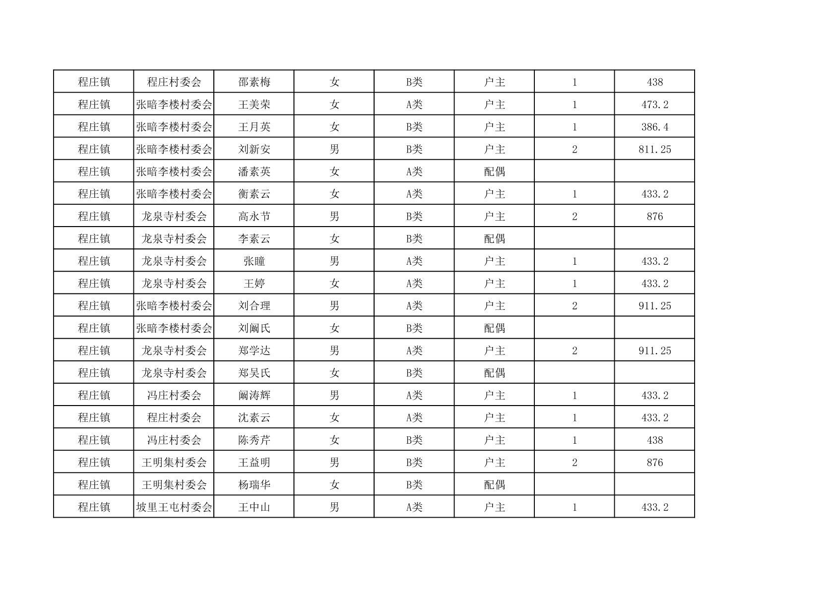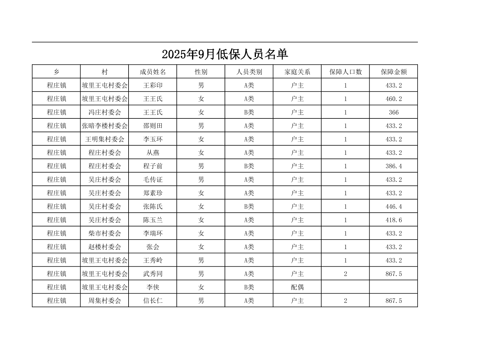 程庄镇2025年9月农保资金发放名册