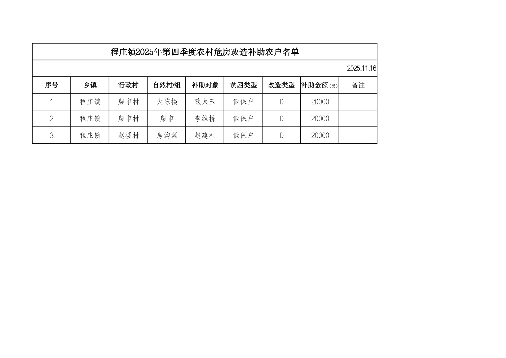 【认定结果】程庄镇2025年第四季度农村危房改造补助农户名单认定结果