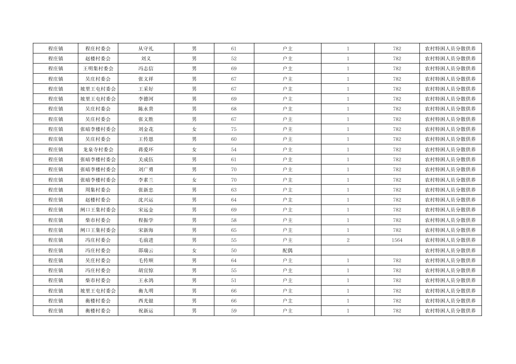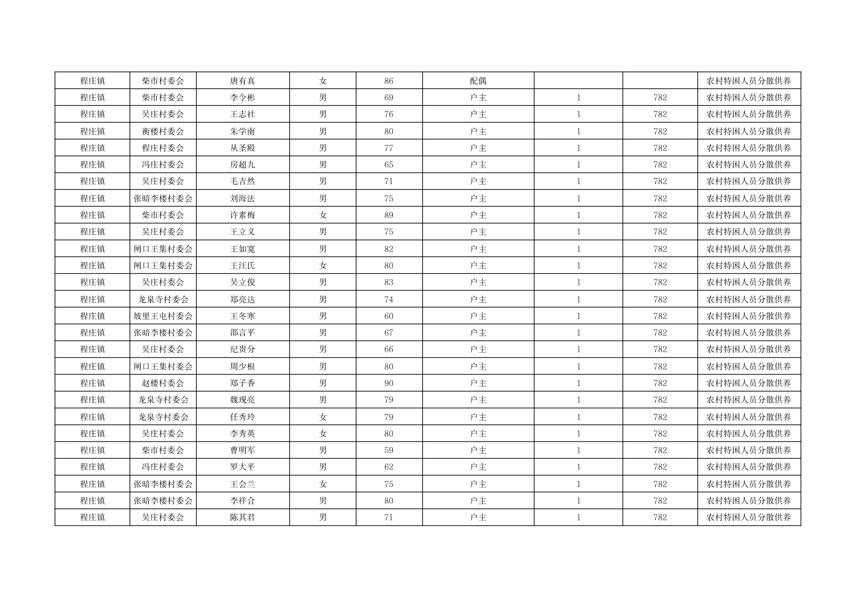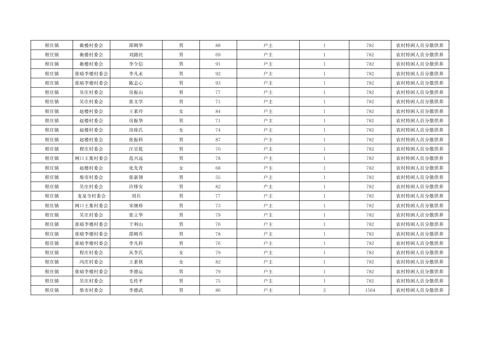 程庄镇2025年11月分散供养特困人员资金发放花名册