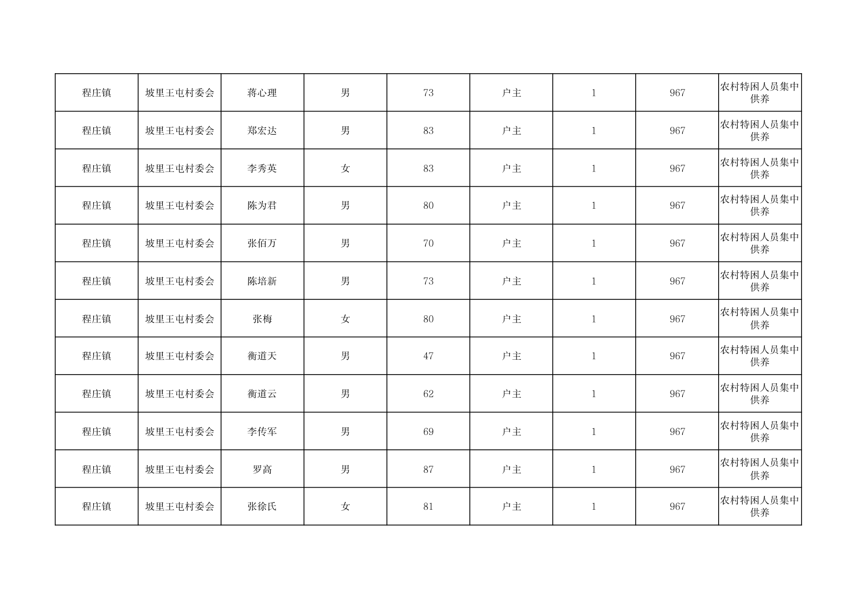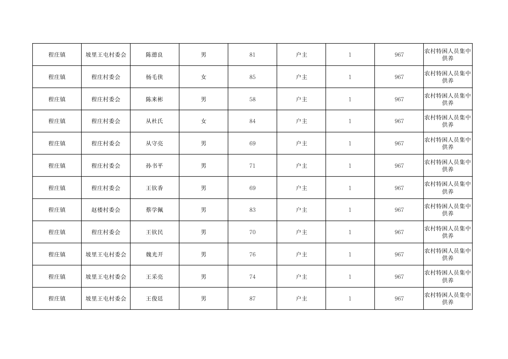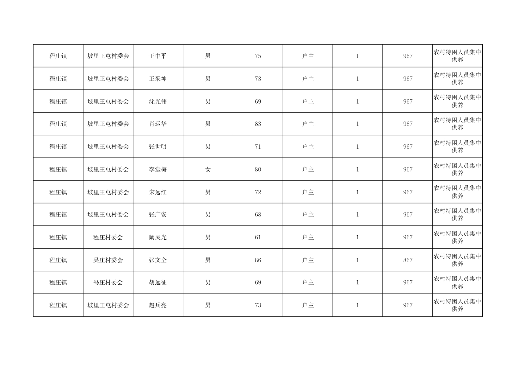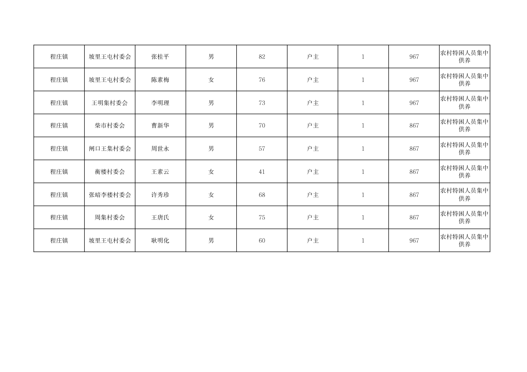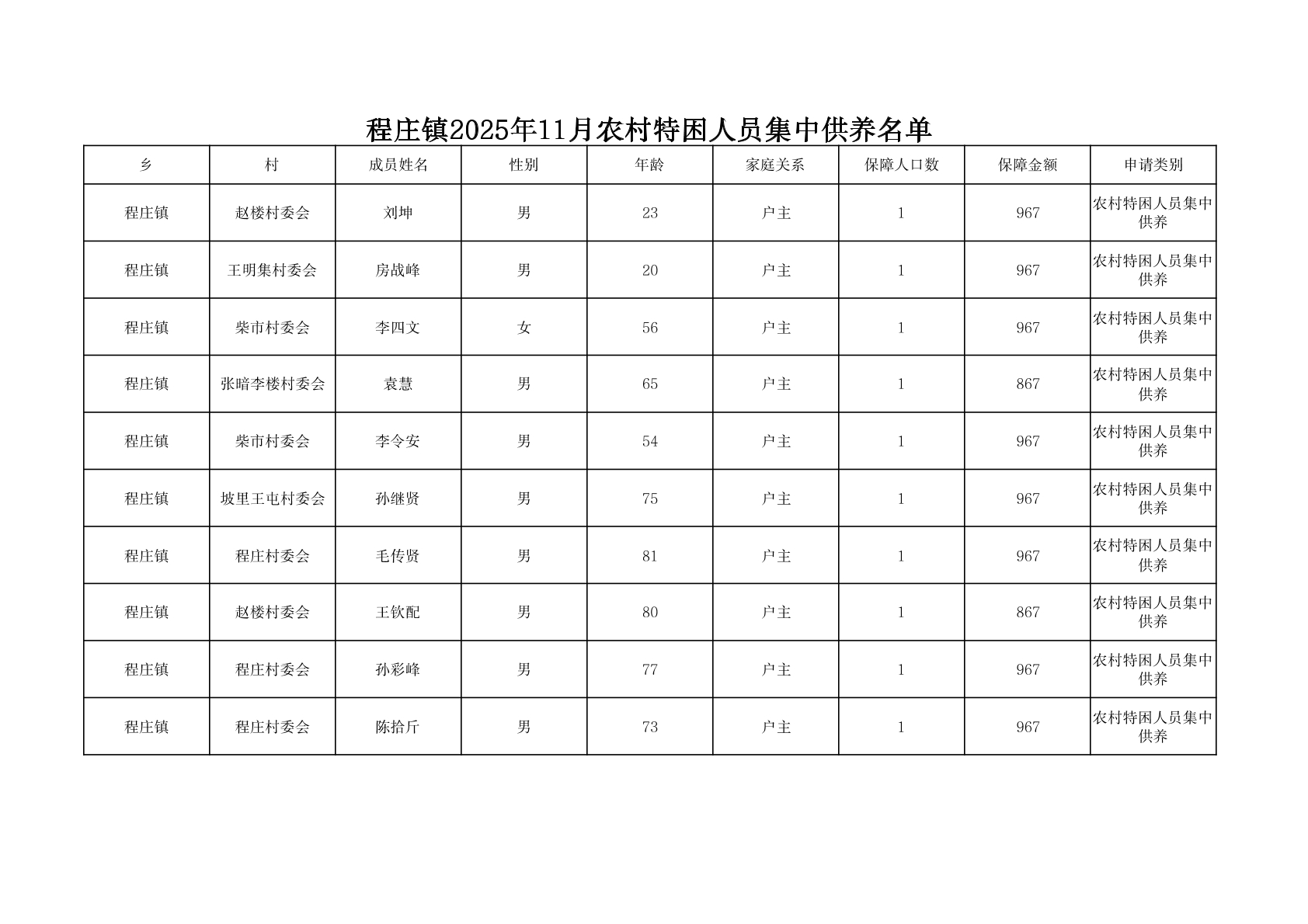 程庄镇2025年11月集中供养特困人员资金发放花名册