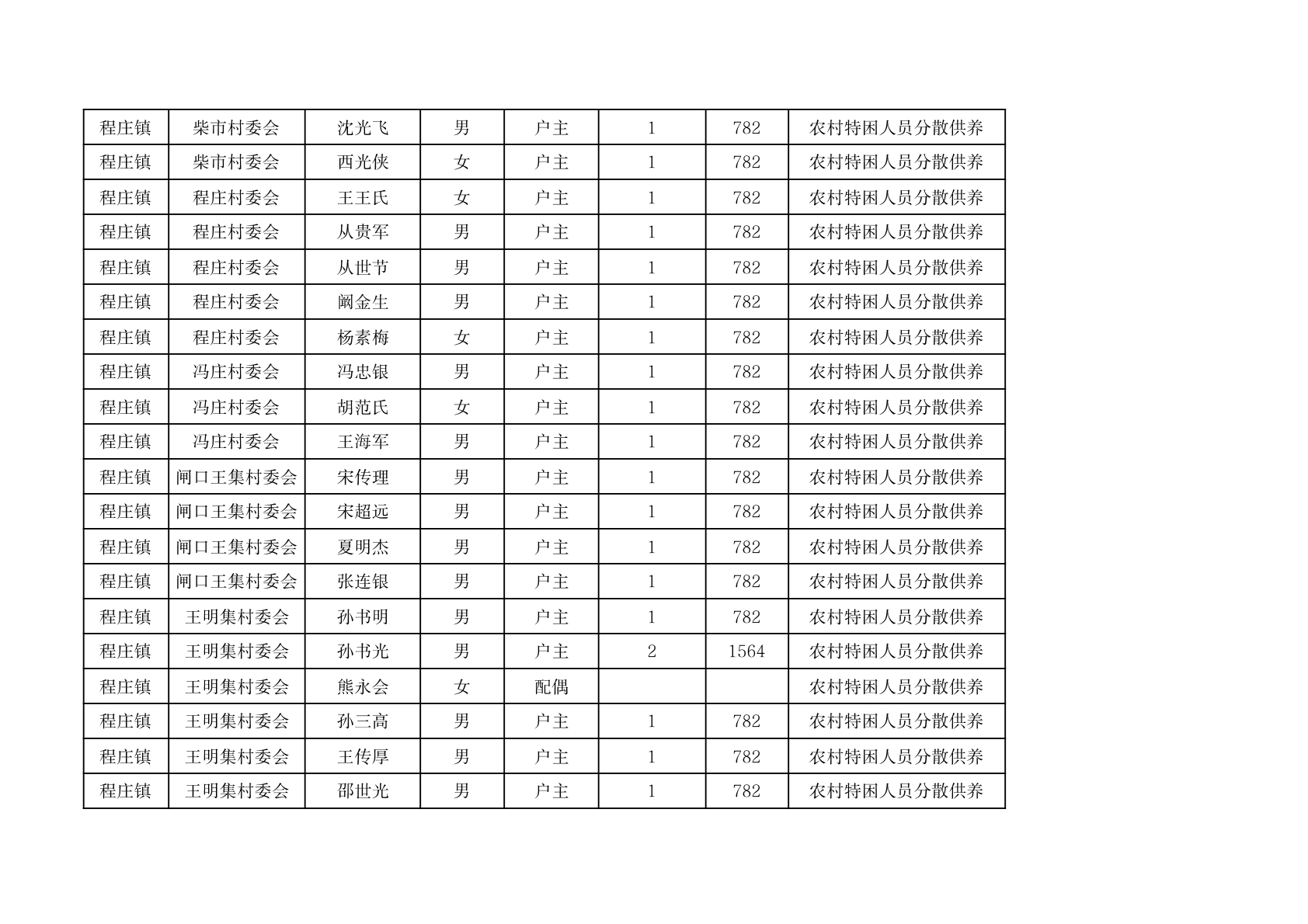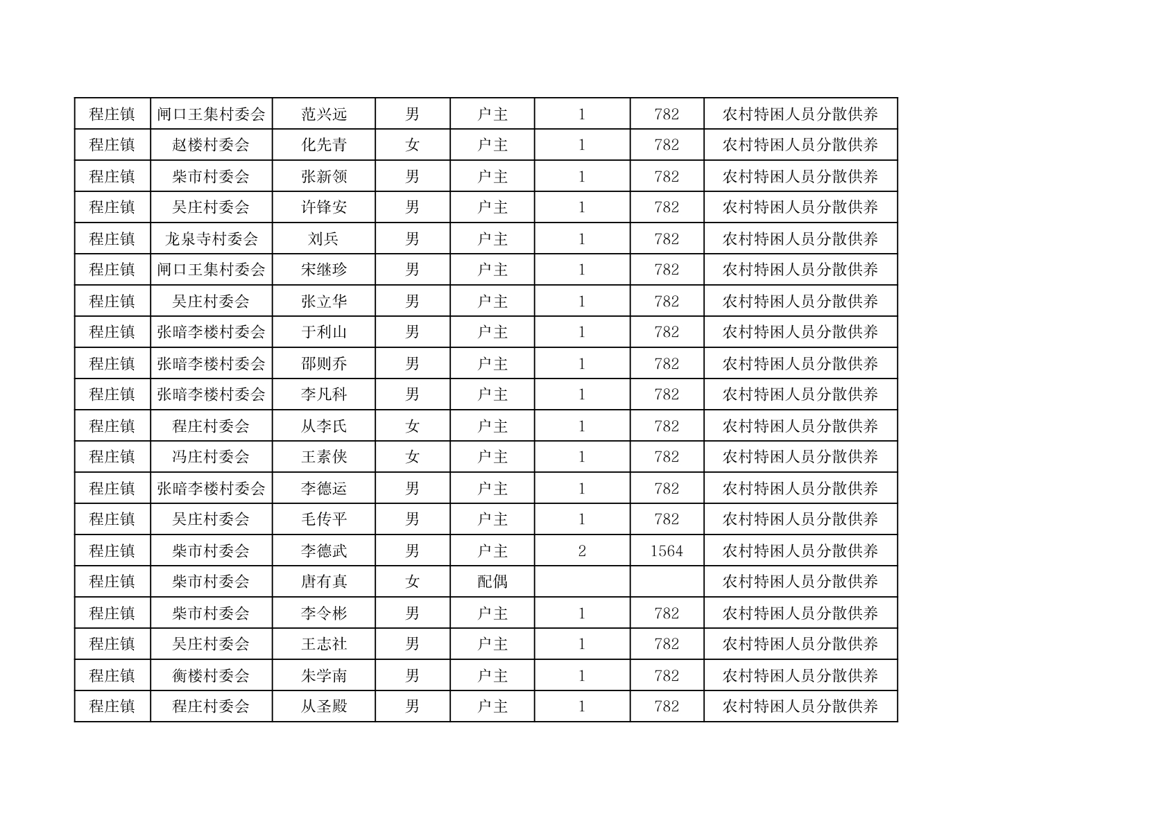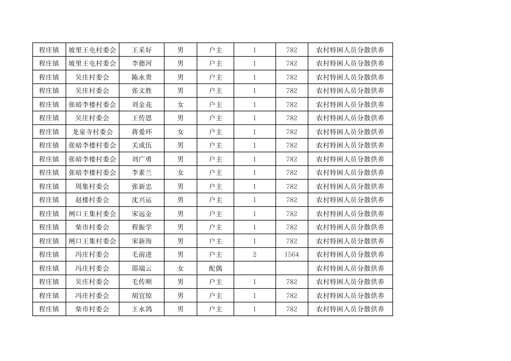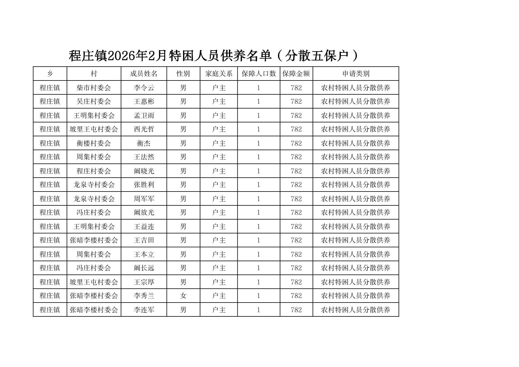 程庄镇2026年2月分散供养特困人员资金发放花名册