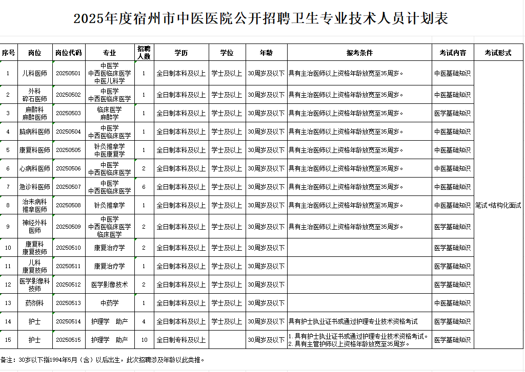 具体招聘要求及人数详见《2025年度宿州市中医医院公开招聘卫生专业技术人员计划表》。