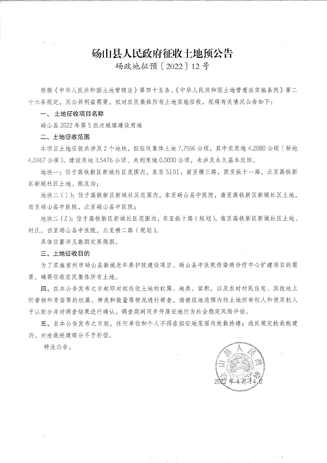 砀山县2022年第5批次城镇建设用地征收土地预公告