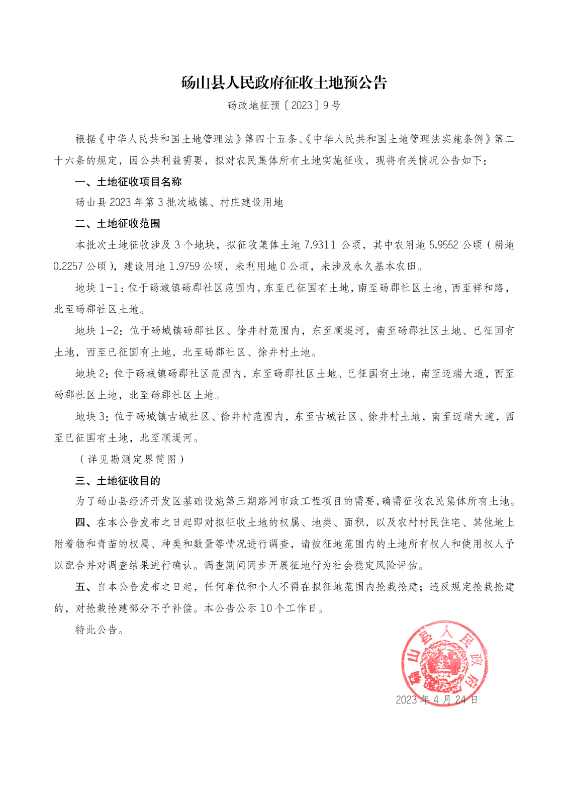 砀山县2023年第3批次城镇、村庄建设用地征收土地预公告