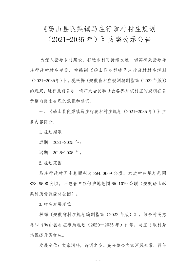 《砀山县良梨镇马庄行政村村庄规划(2021-2035年)》方案公示公告