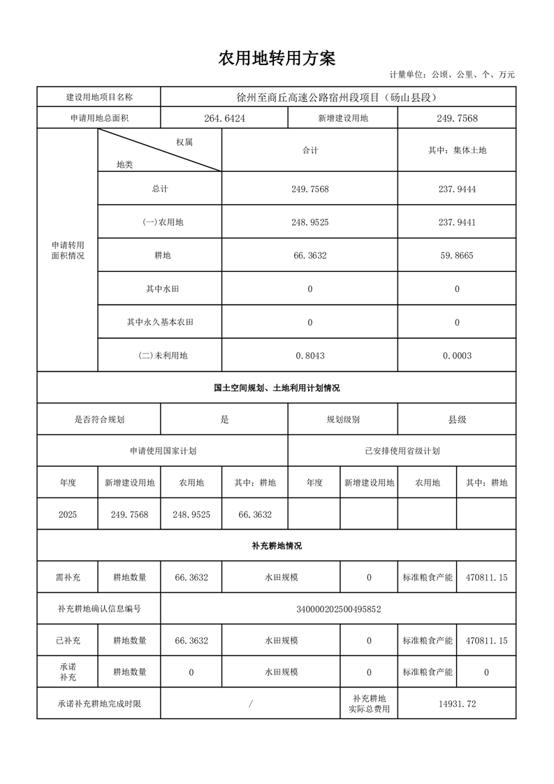 徐州至商丘高速公路宿州段项目砀山县段农转用方案