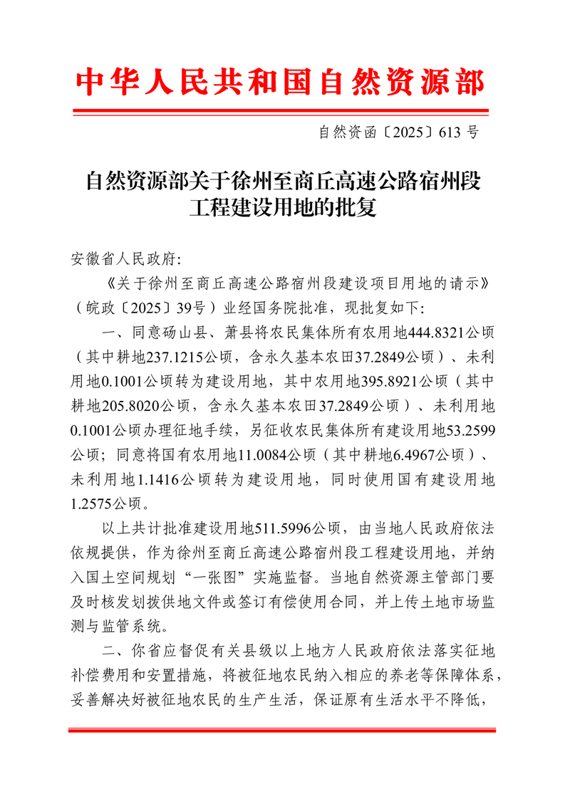 徐州至商丘高速公路宿州段项目砀山县段办结批复