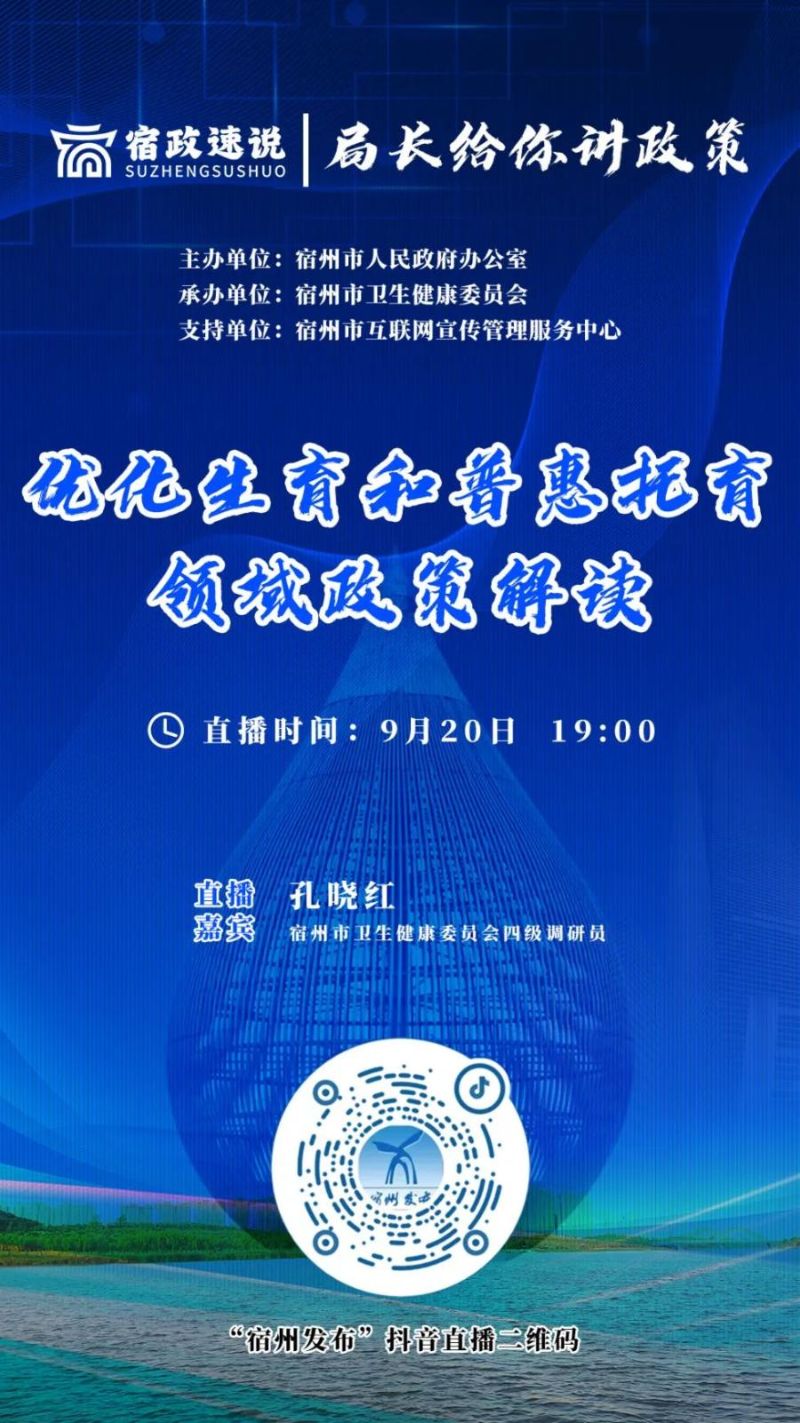 9月20日(星期三)19:00,宿州市人民政府办公室邀请宿州市卫生健康委员会四级调研员孔晓红,走进“宿政速说·局长给你讲政策”直播栏目,与大家线上“面对面”,解读当前我市优化生育、普惠托育政策,实时解答热点难点问题。大家如果有优化生育、普惠托育方面的疑问,可以在“宿州发布”抖音直播预告评论区留言,直播时将统一进行解答。