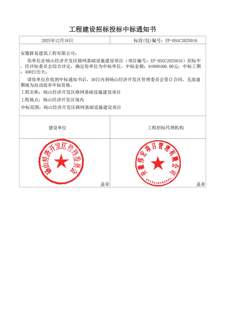 工程建设招标投标中标通知书