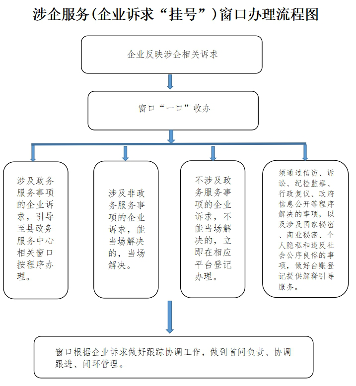 立足企业和群众视角,持续深化“一制度两窗口”,在县政务服务中心设立涉企服务(企业诉求“挂号”)窗口(以下简称“挂号”窗口),落实落细企业诉求“挂号制”,做到企业诉求线下“一口”收办和全流程闭环管理,深入推进“企呼政应、接诉即办”,高效办成企业诉求“一件事”。