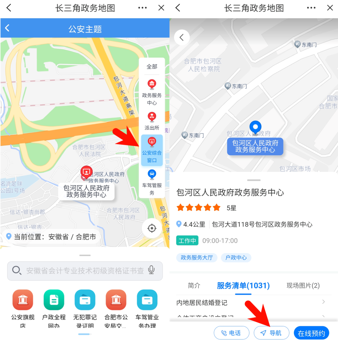 进入长三角政务地图公安主题地图,点击右侧筛选场所类型,选择“公安综合窗口”,点击地图上的图标可以进入场所详情页,查看场所的简介、服务清单信息后,点击“导航”即可前往办理。
