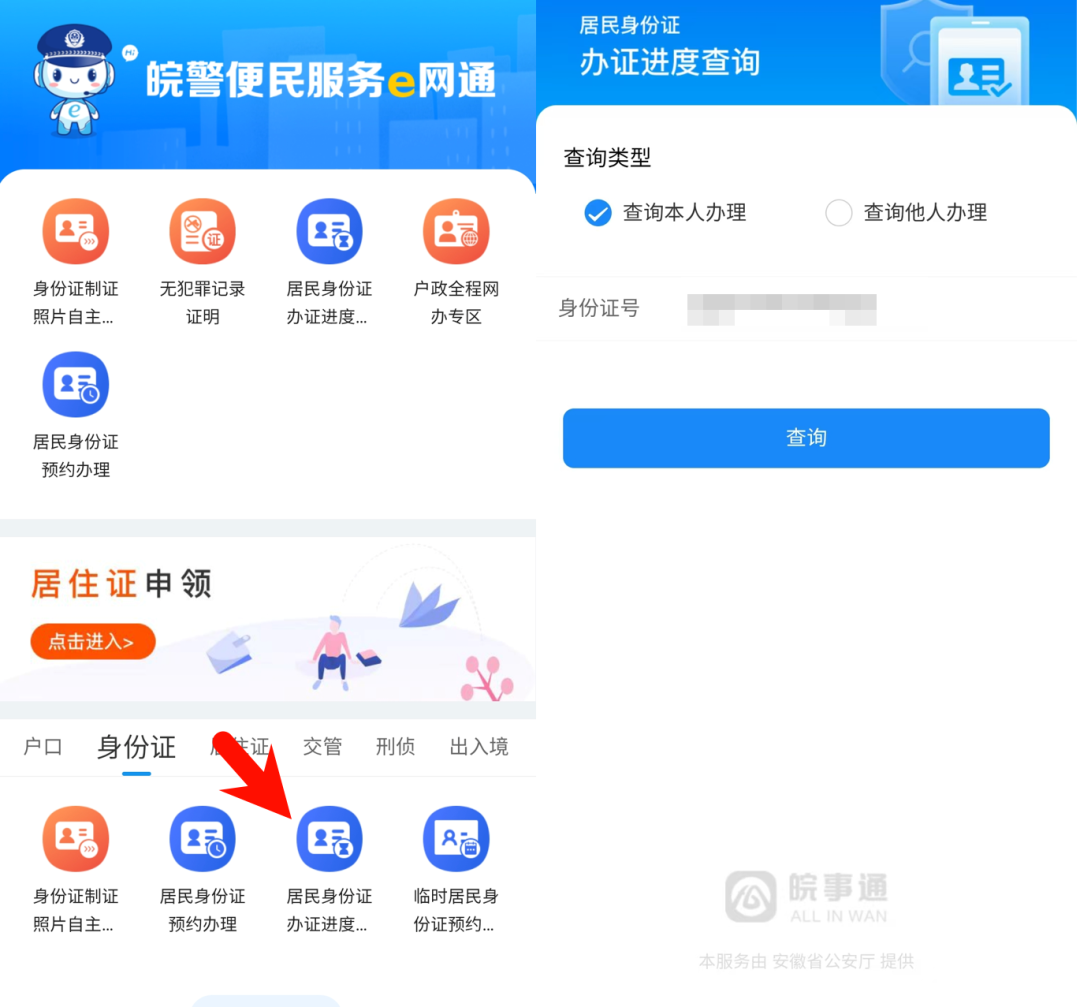 业务办理后可以在公安主题地图首页进入“公安旗舰店”,点击“居民身份证办证进度查询”服务查询身份证办理进度。