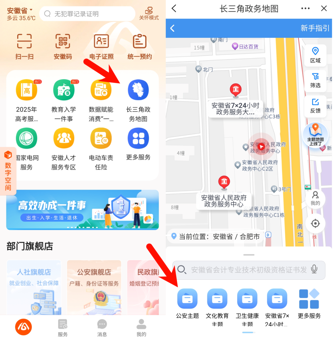 下载“皖事通”APP并注册登录,点击“长三角政务地图”,然后在首页选择公安主题,点击进入。