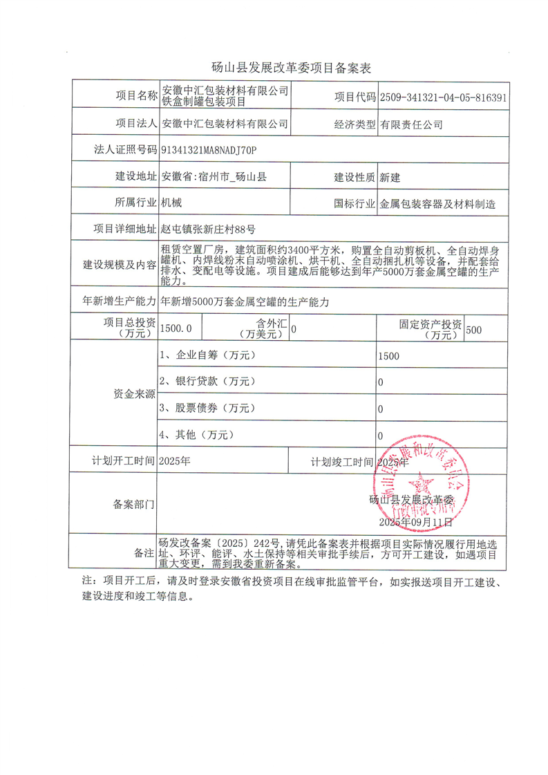 安徽中汇包装材料有限公司铁盒制罐包装项目 |