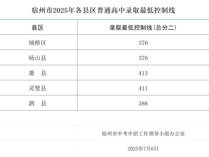 【主动回应】宿州市2025年中招各县区普通高中录取最低控制线(公布)