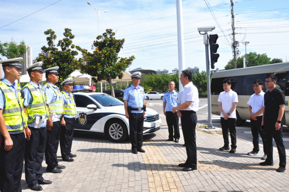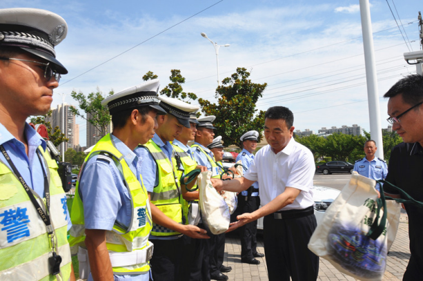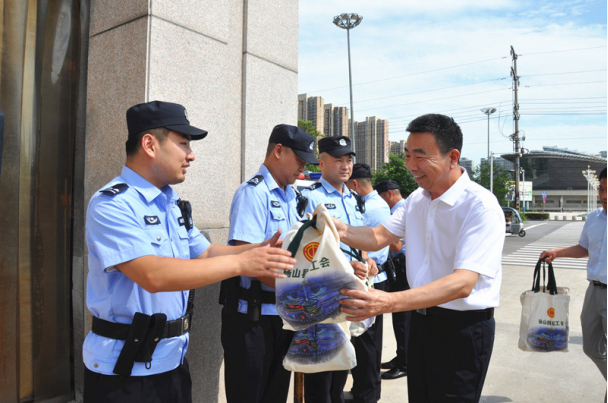 县委书记唐明在副县长郑峰的陪同下慰问高温下的执勤警员