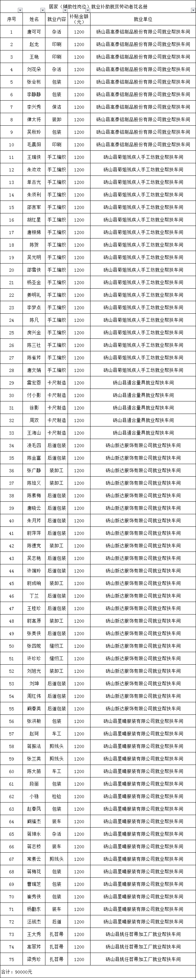 经对6家就业帮扶车间申报的2022年7月至2022年12月居家就业岗位补贴审核,唐可可等75人的居家就业岗位补贴符合发放条件,合计90000元。