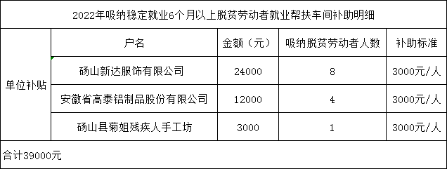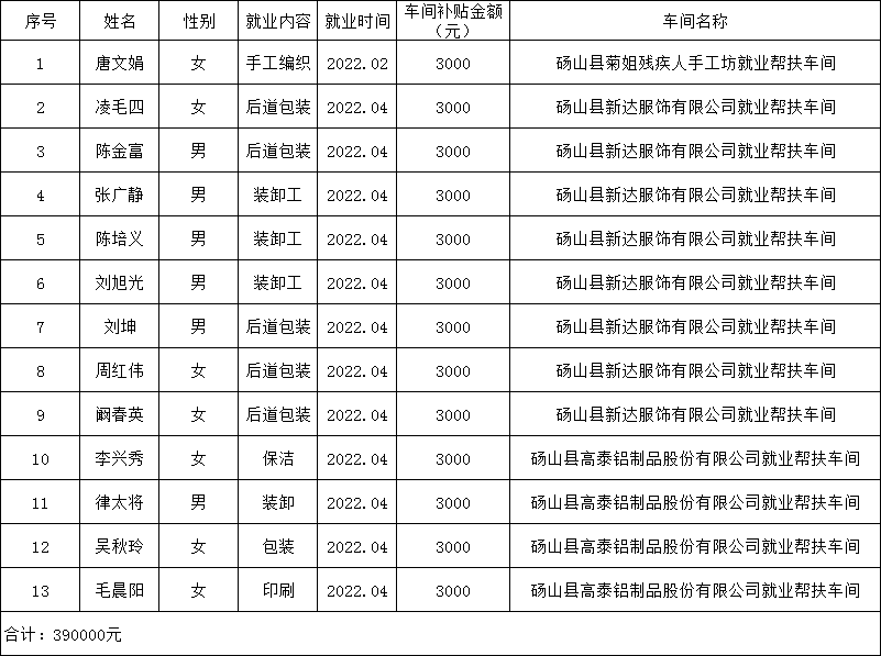 【就业帮扶】2022年吸纳稳定就业6个月以上脱贫劳动者就业帮扶车间补助发放公示