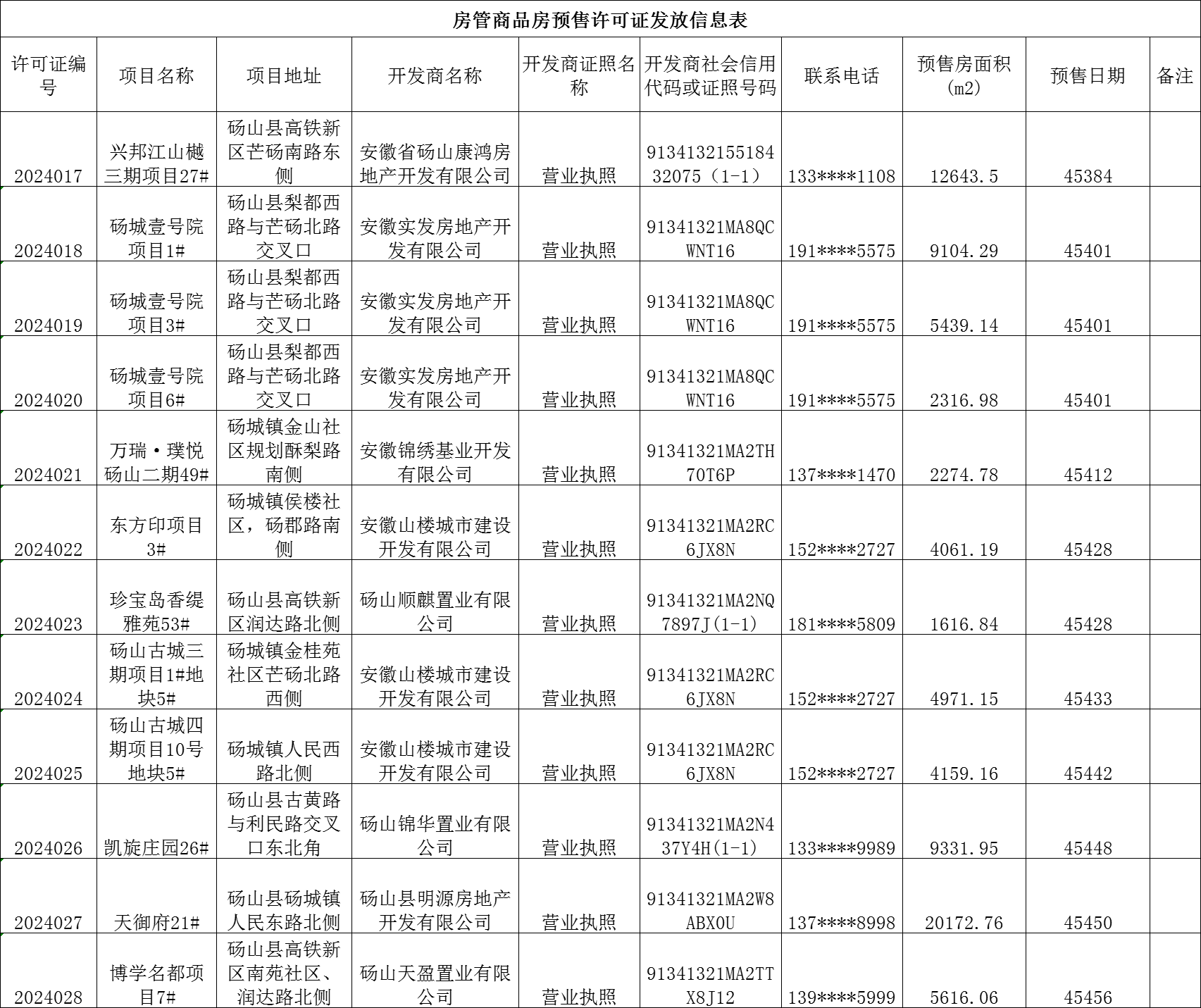 砀山县2024年第二季度商品房预售许可证发放一览表