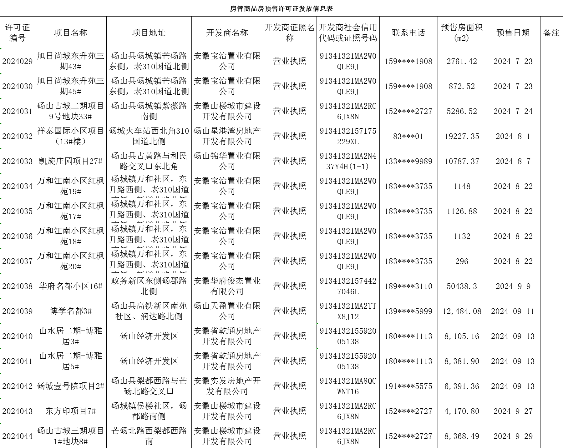 砀山县2024年第三季度商品房预售许可证发放一览表