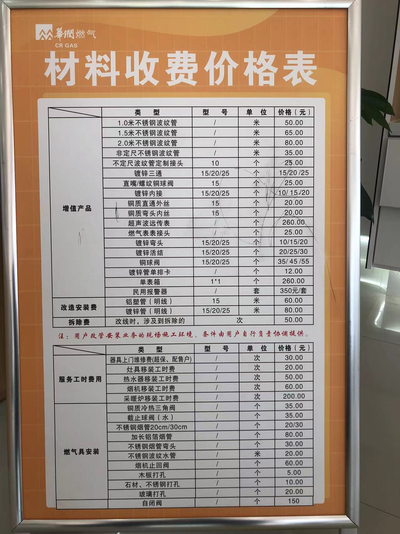 华润燃气材料收费价格表 |