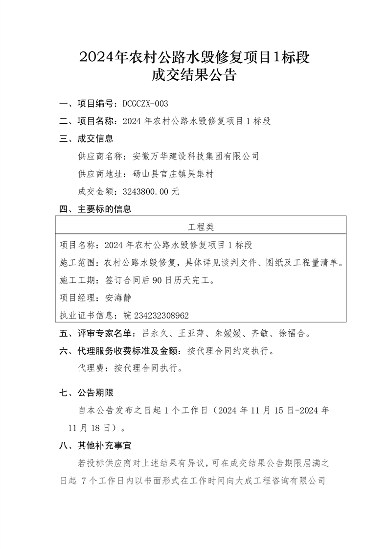 2024年农村公路水毁修复项目1标段成交结果公告