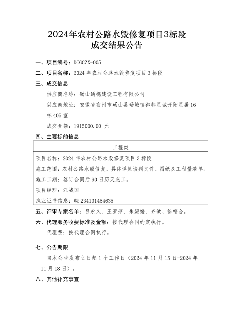 2024年农村公路水毁修复项目3标段成交结果公告 |