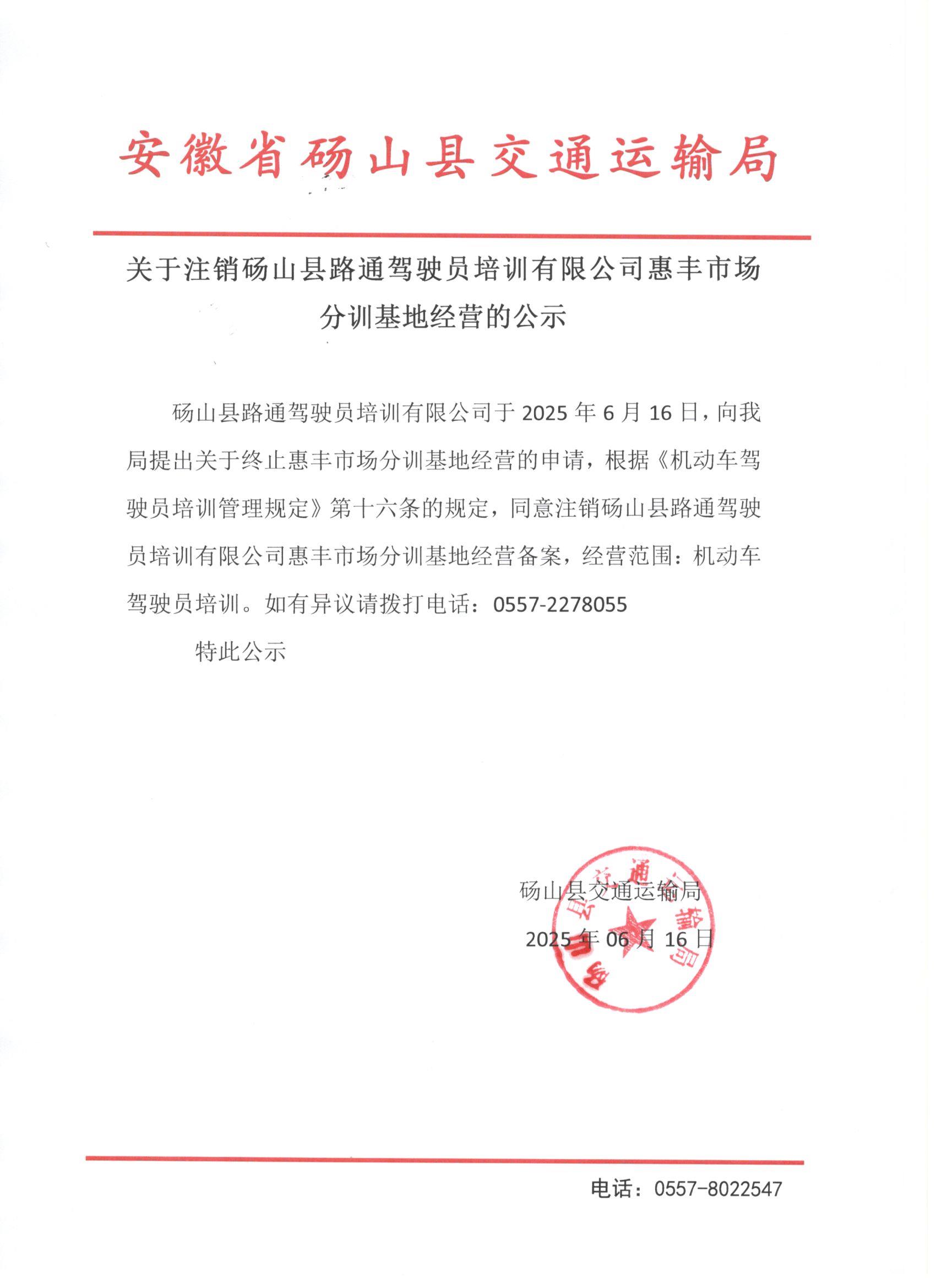 关于注销砀山县路通驾驶员培训有限公司惠丰市场分训基地经营的公示 |