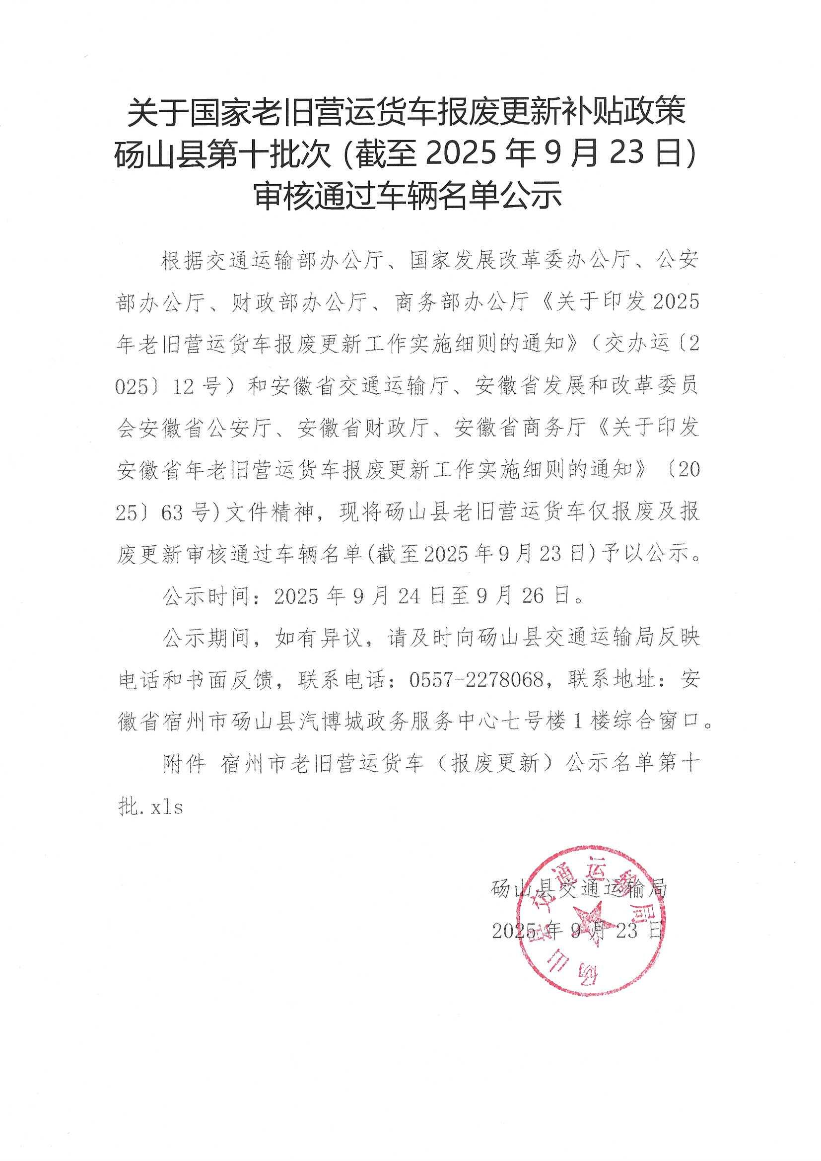 关于国家老旧营运货车报废更新补贴政策砀山县第十批次审核通过车辆名单公示