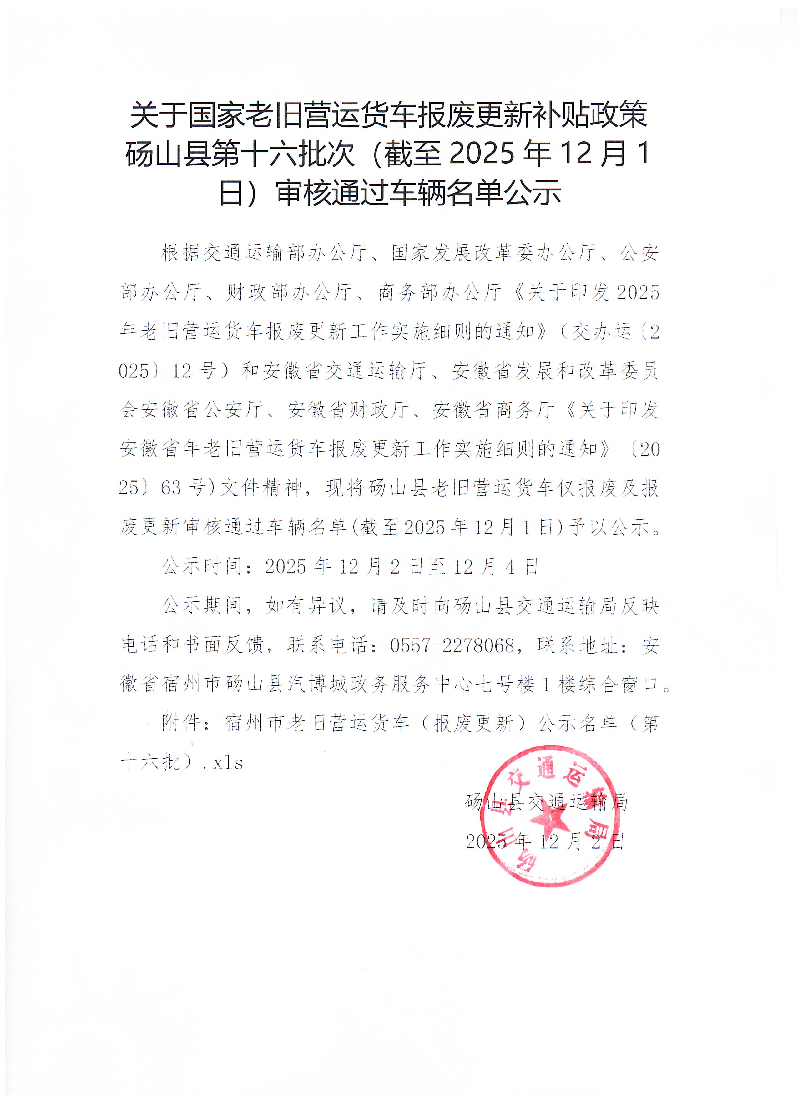 关于国家老旧营运货车报废更新补贴政策砀山县第十六批次审核通过车辆名单公示