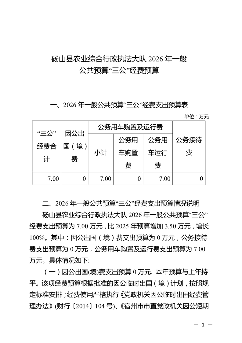 砀山县农业综合行政执法大队2026年一般公共预算“三公”经费预算 |