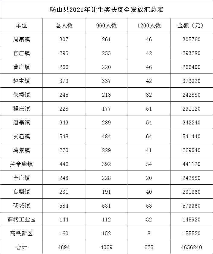 砀山县2021年计生奖扶资金发放汇总表