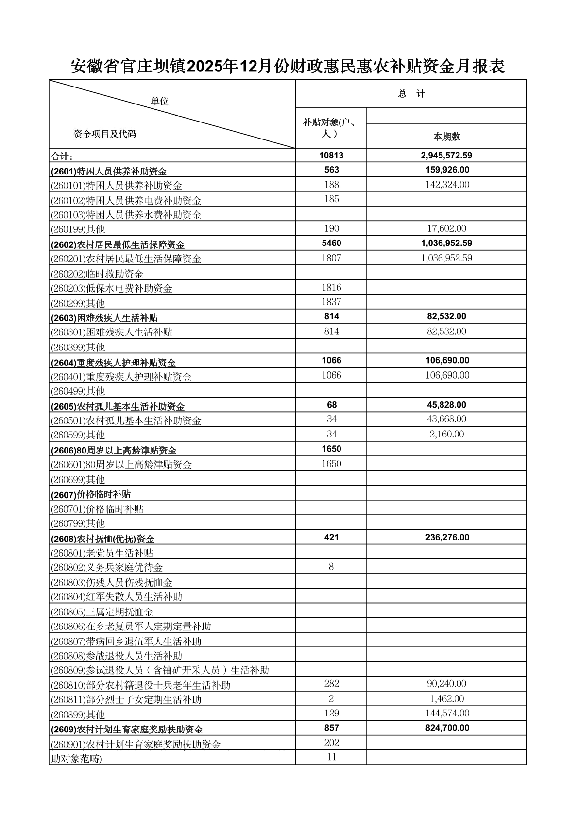 【惠民惠农资金】安徽省官庄坝镇2025年12月份财政补贴农民资金发放月报表 |
