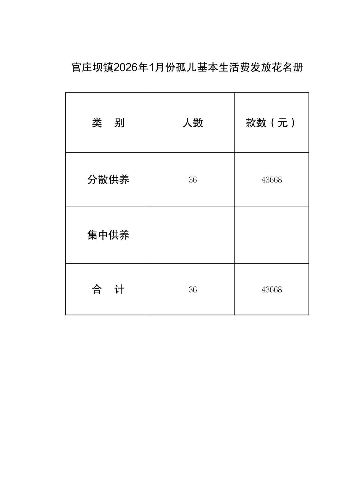 官庄坝镇2026年1月份孤儿基本生活保障资金分配结果 |
