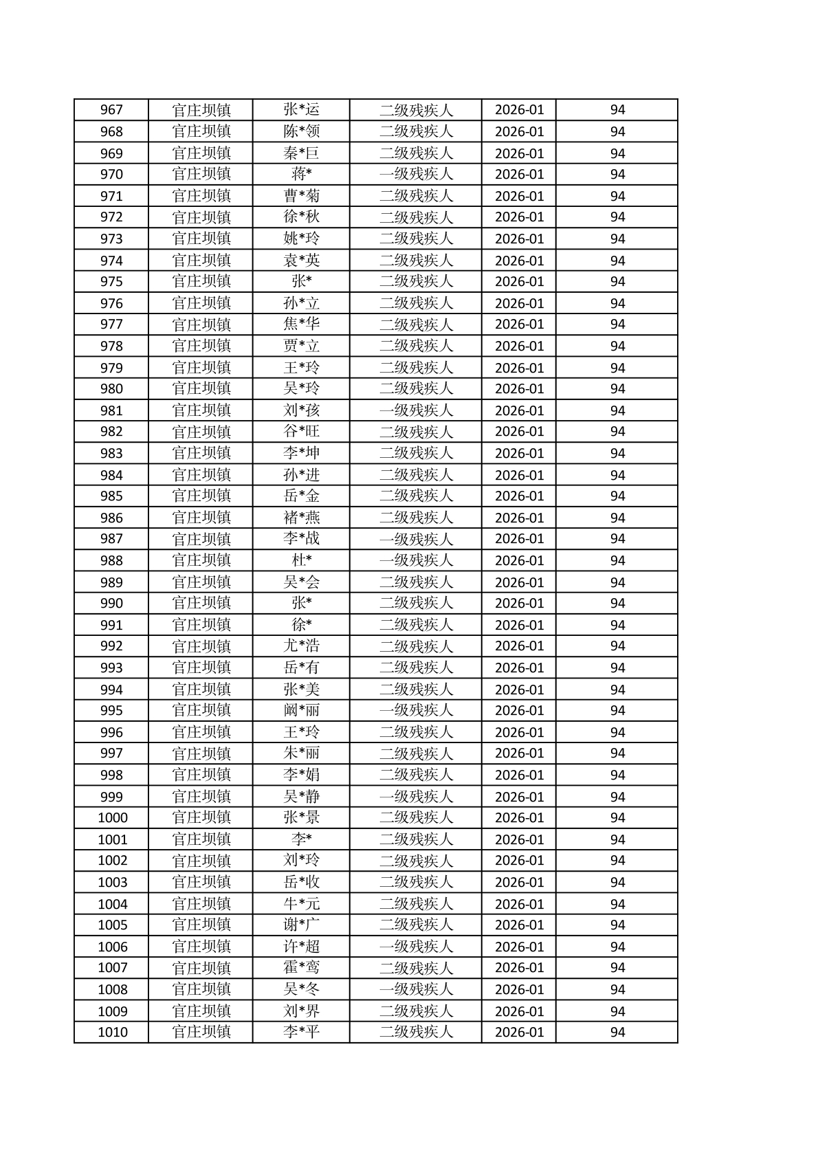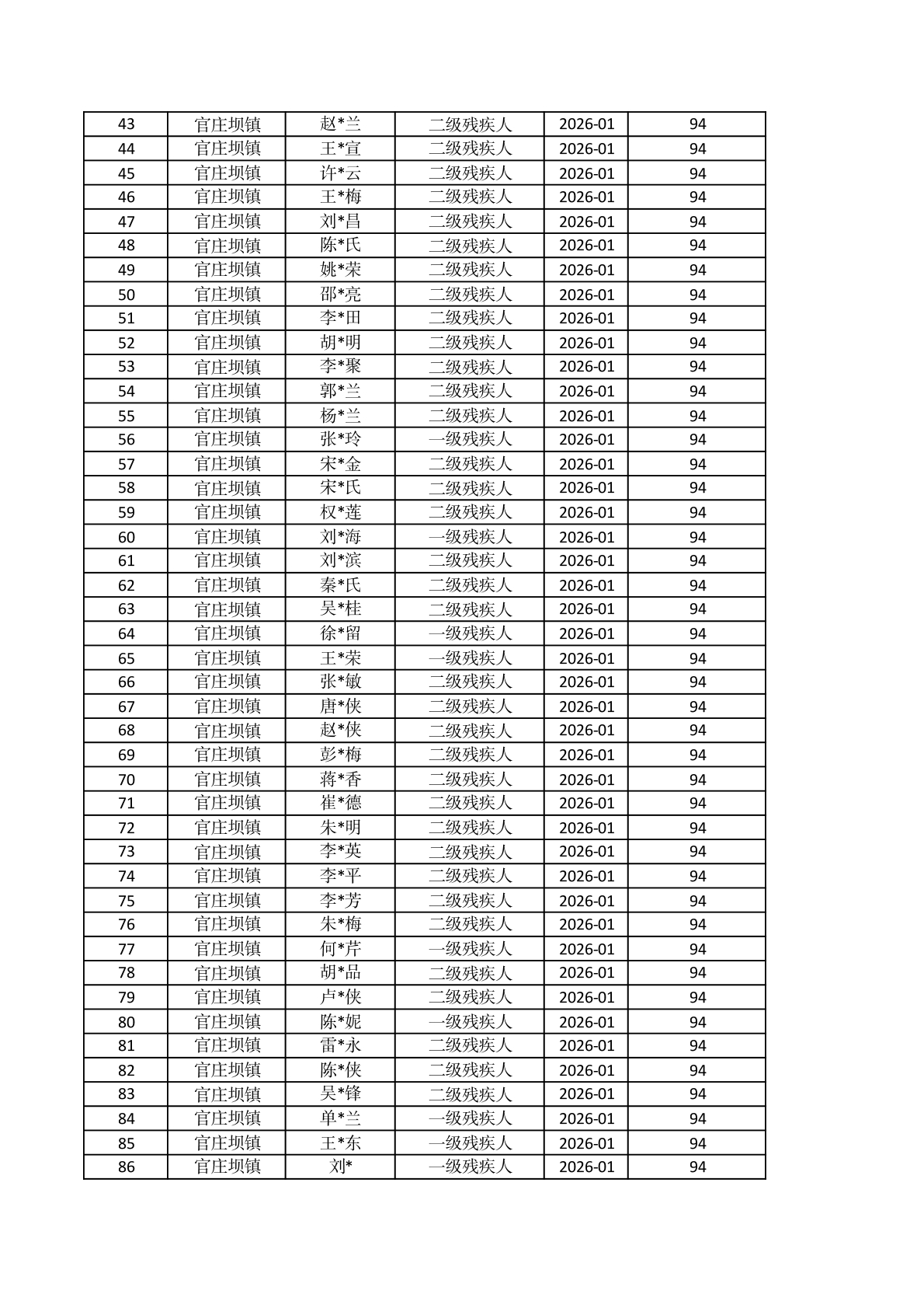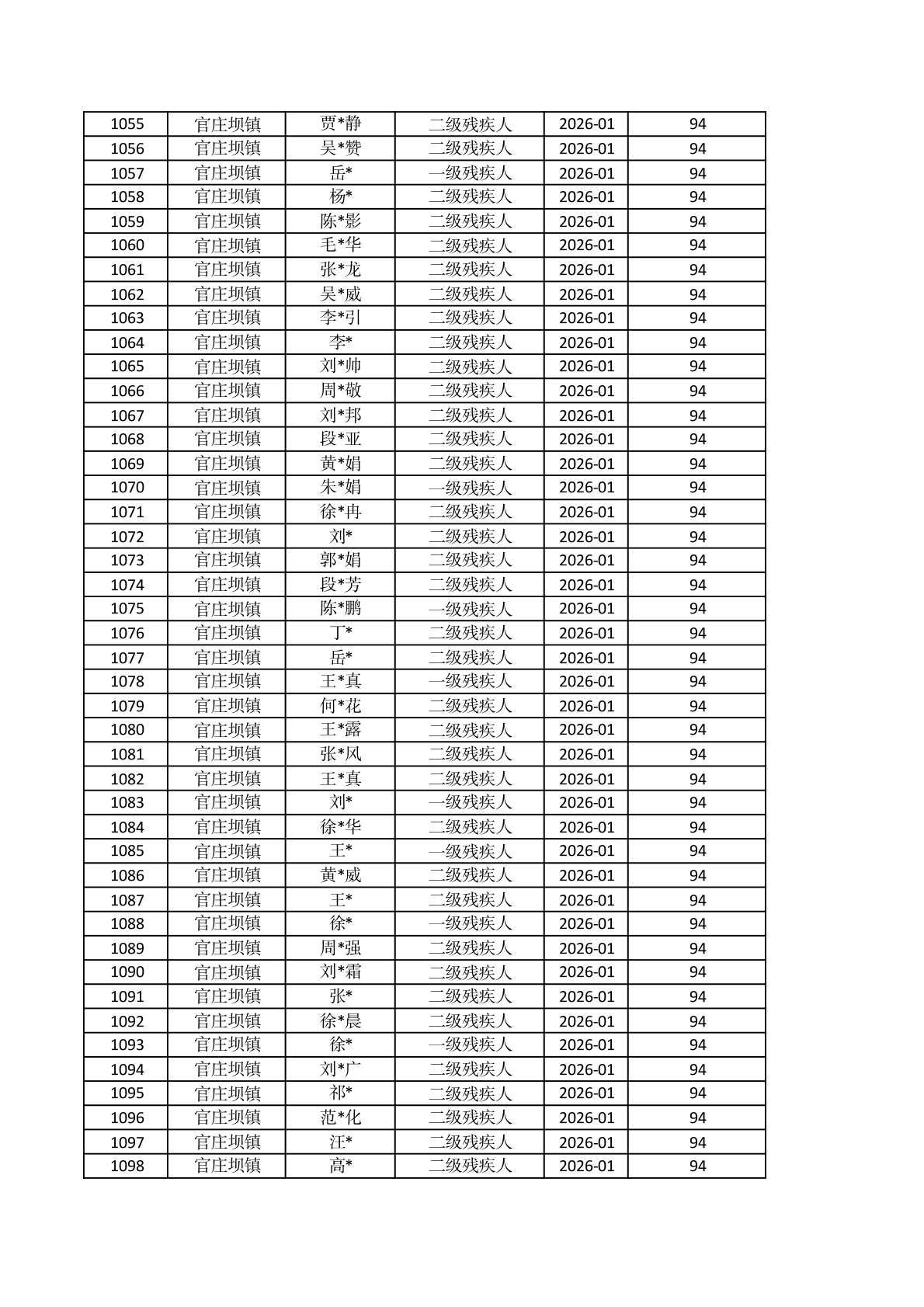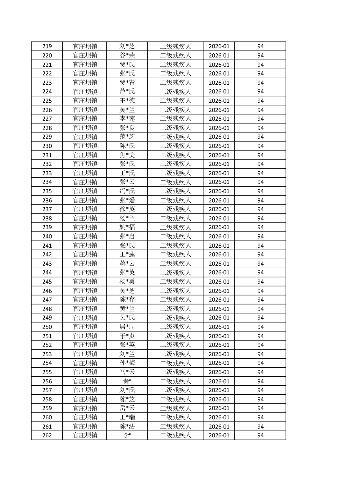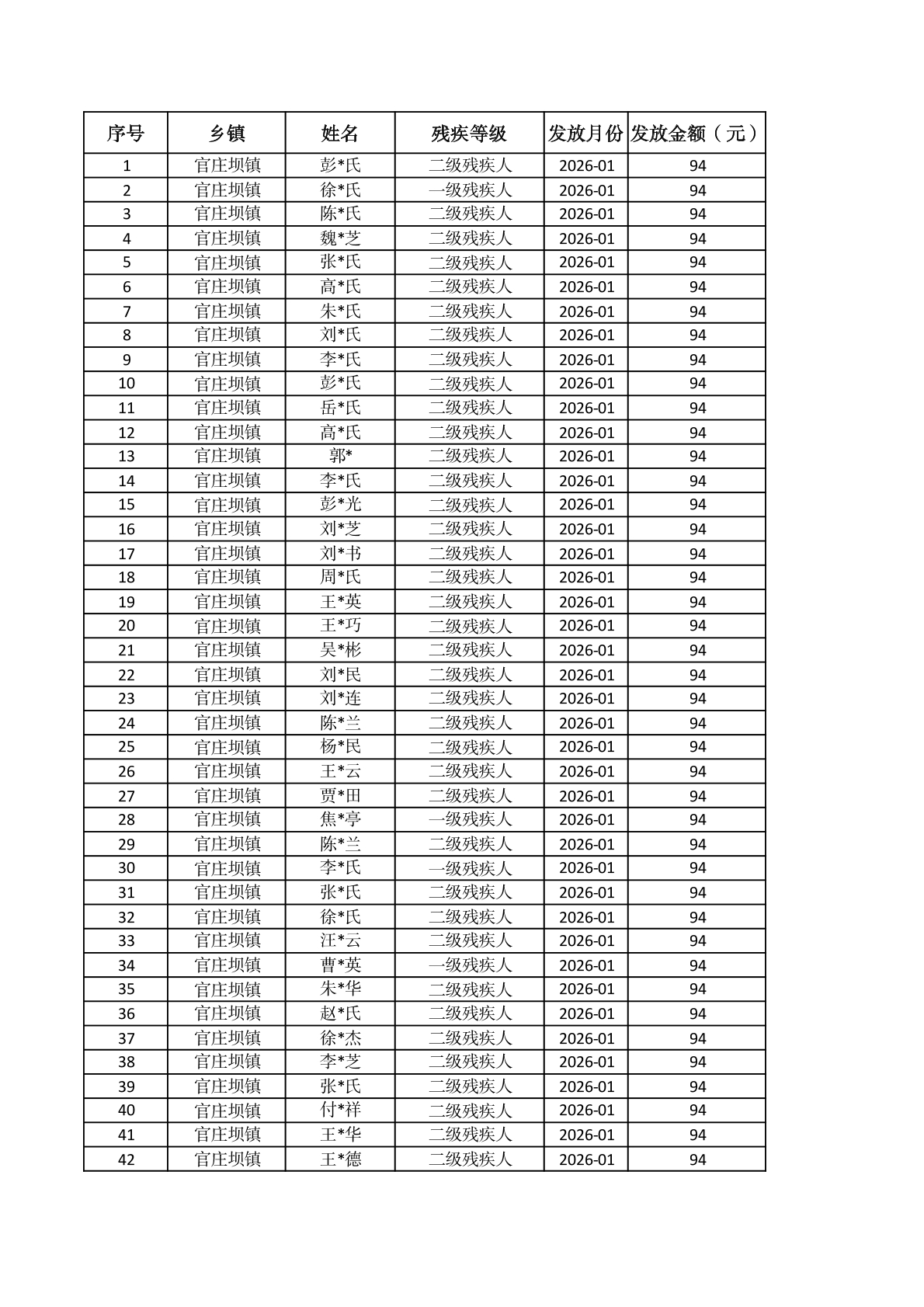 官庄坝镇2026年1月重度残疾人护理补贴资金发放花名册 |