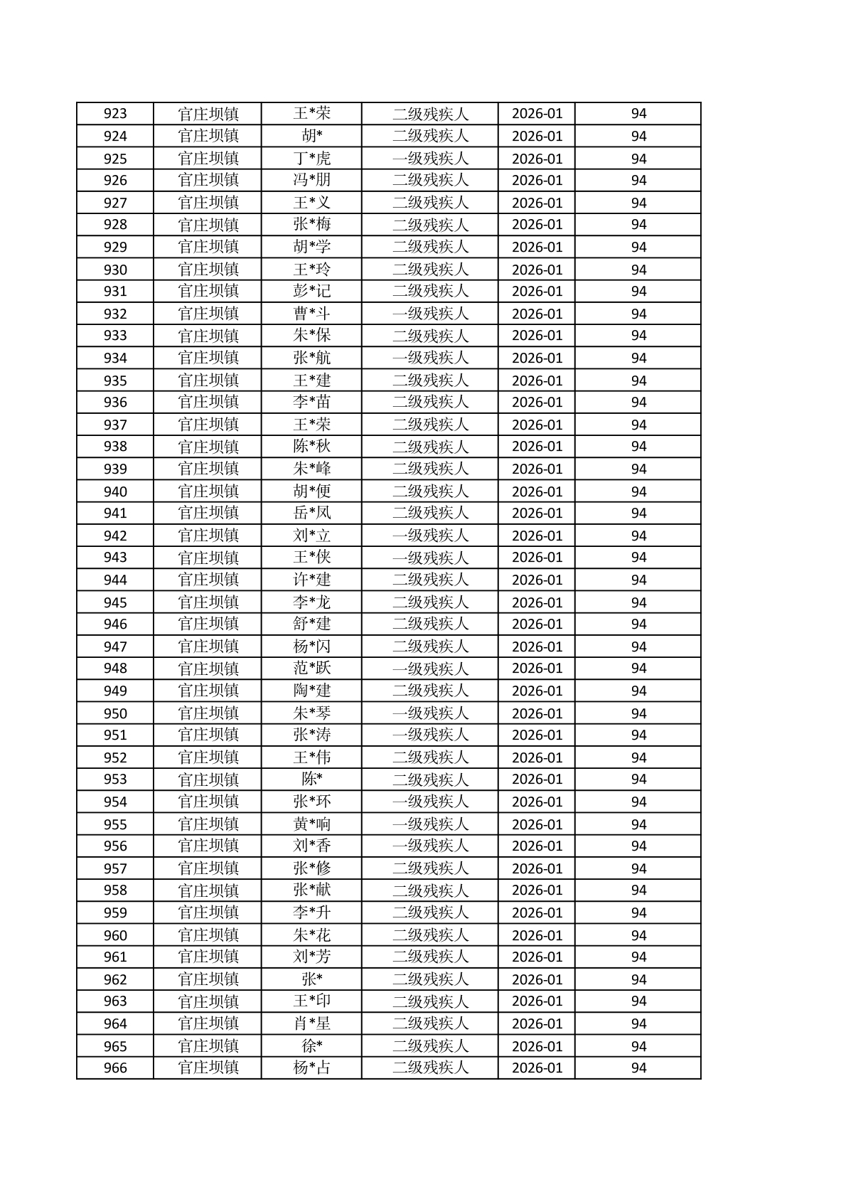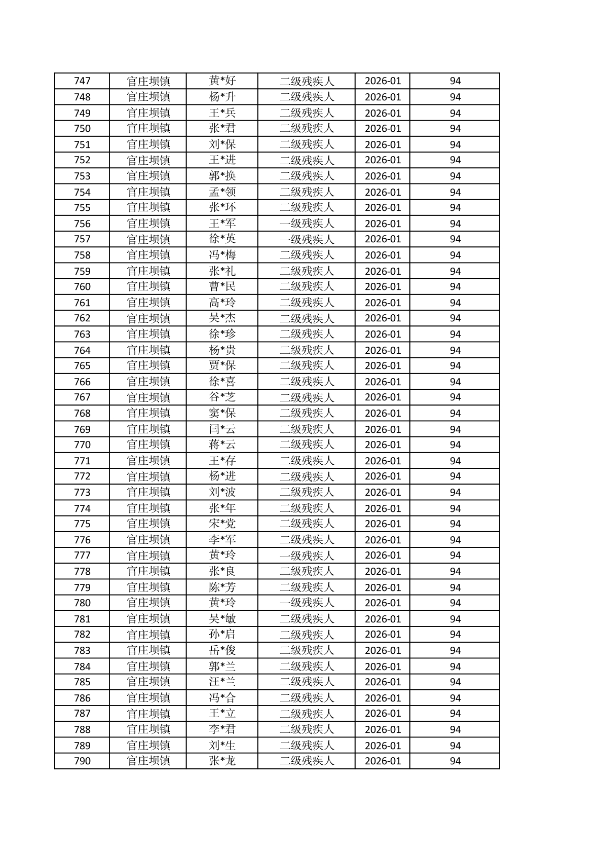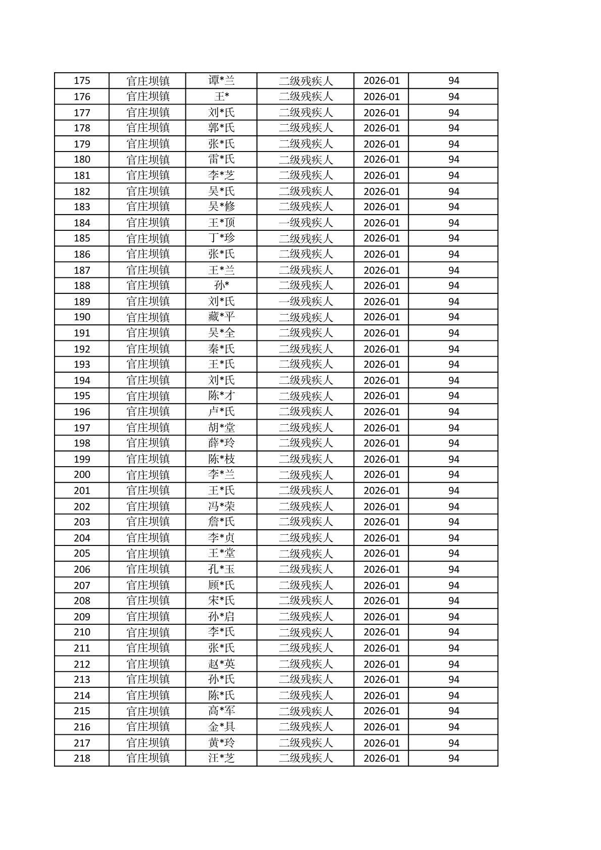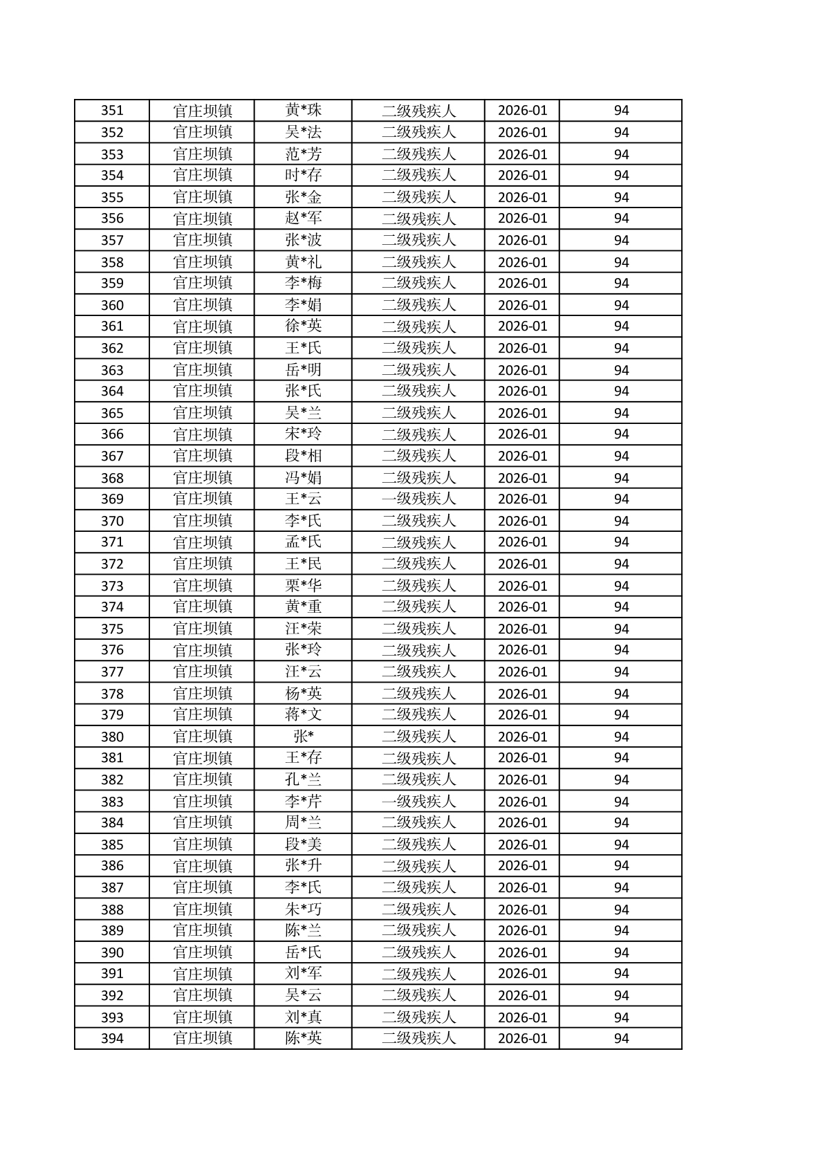 官庄坝镇2026年1月重度残疾人护理补贴资金发放花名册 |