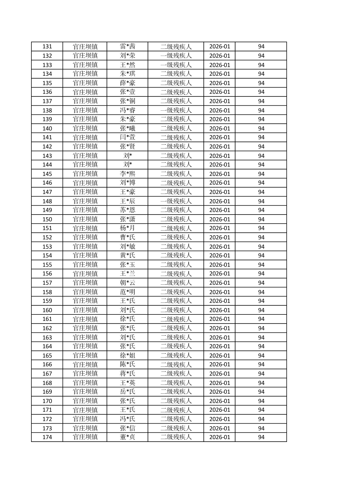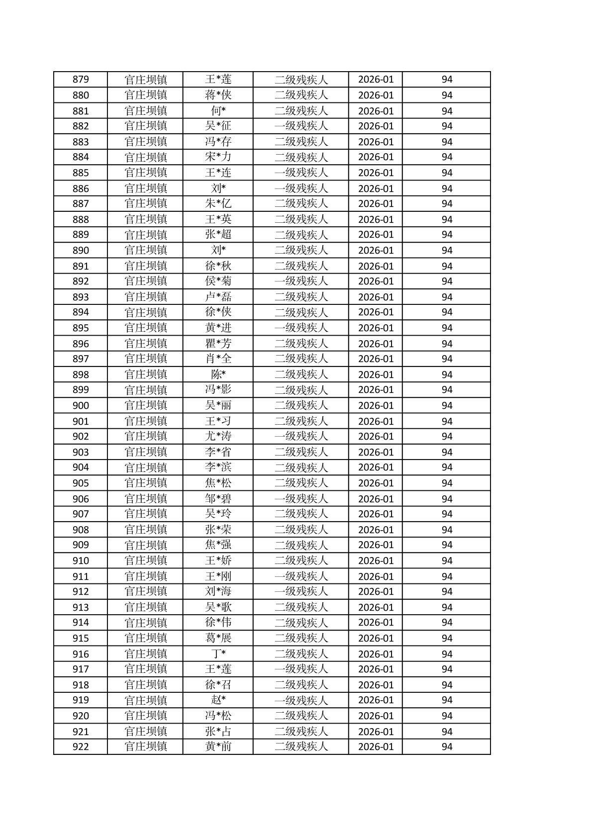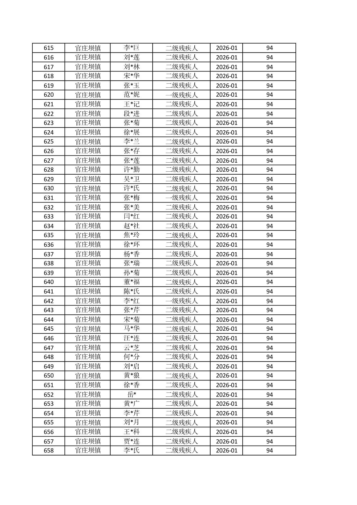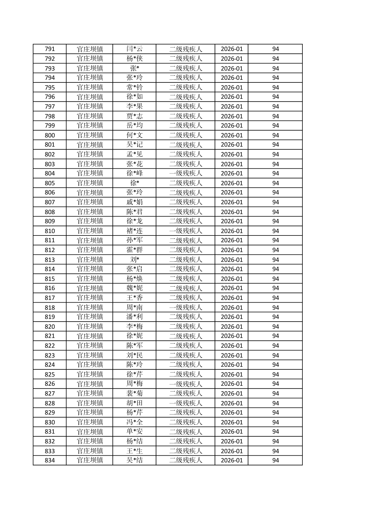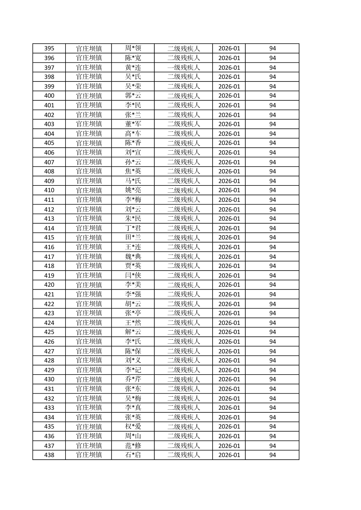 官庄坝镇2026年1月重度残疾人护理补贴资金发放花名册 |