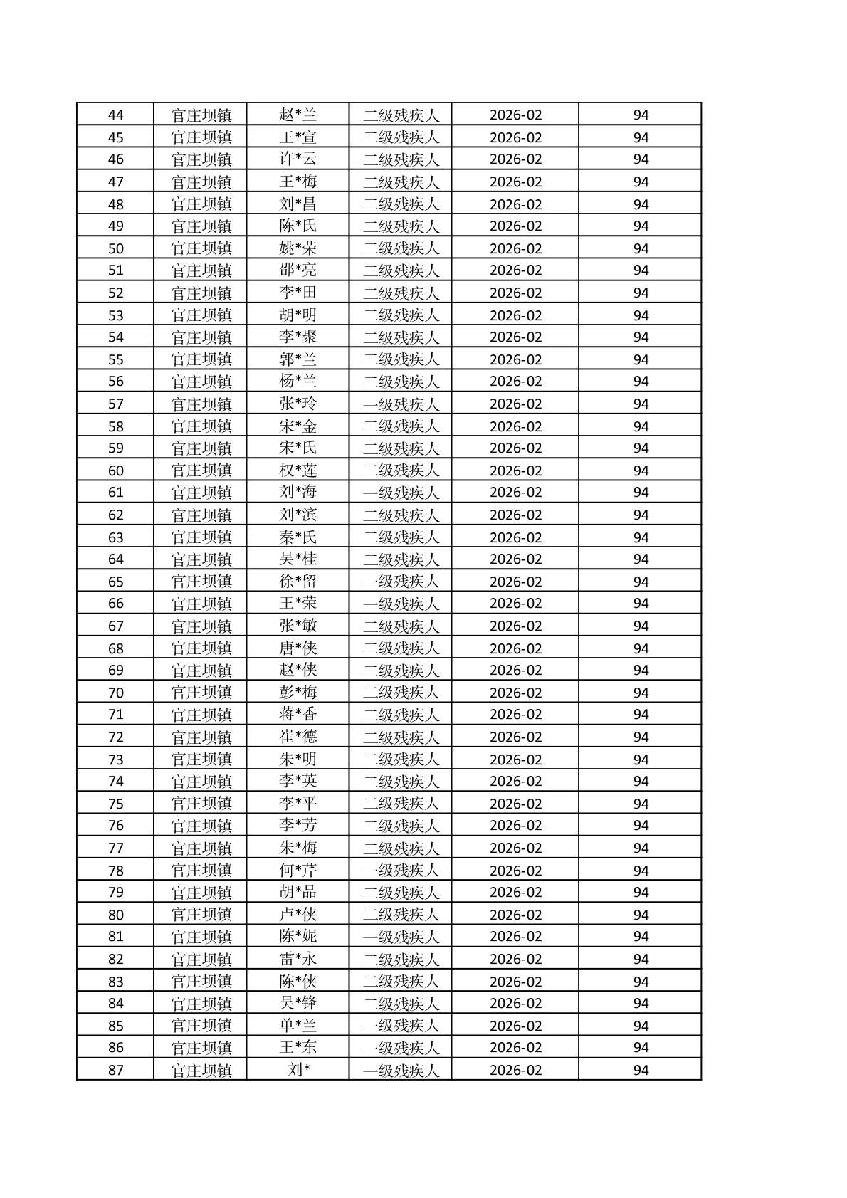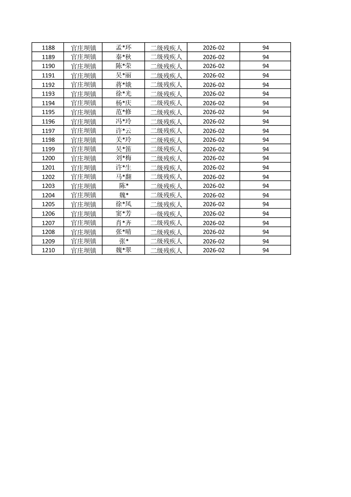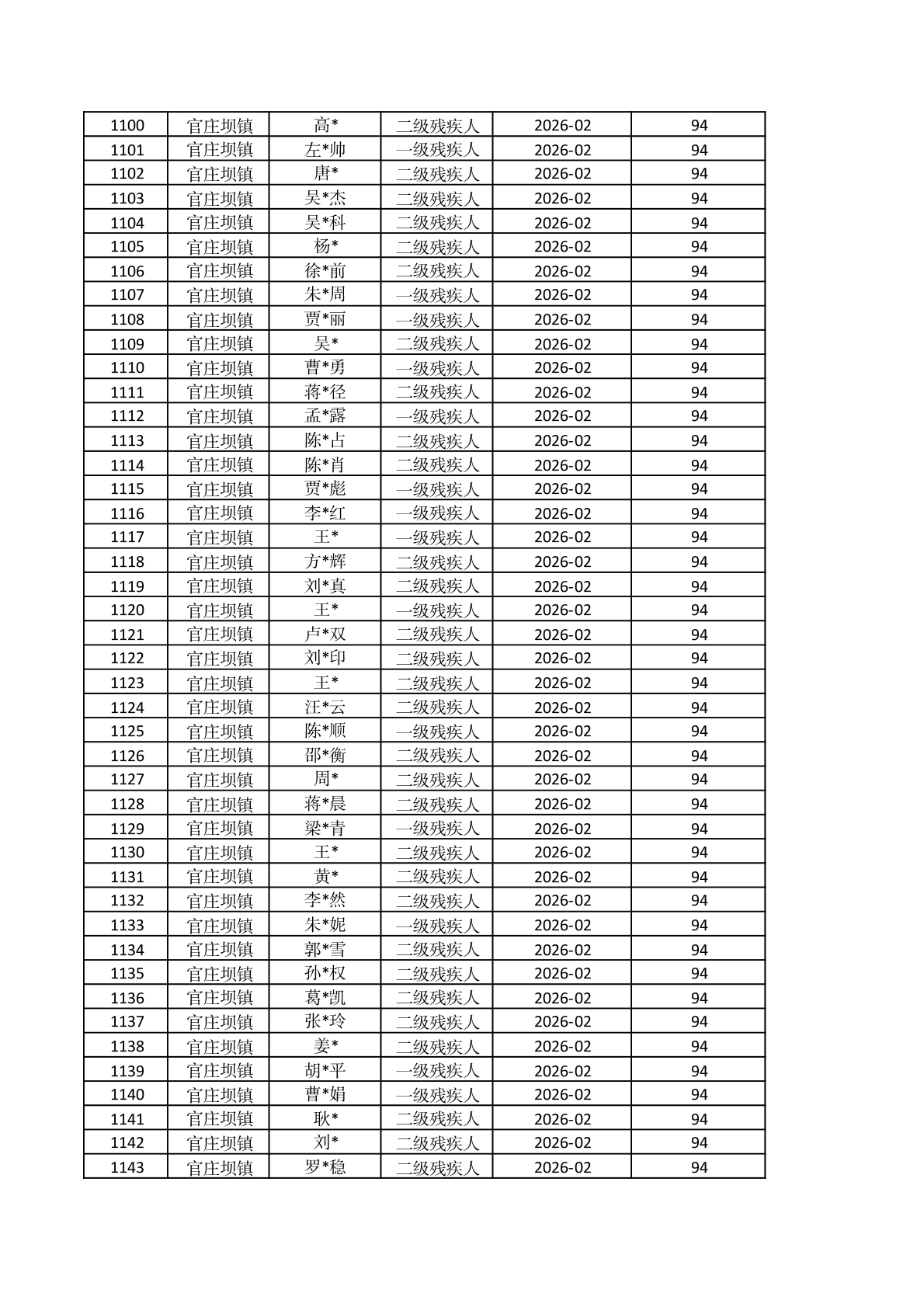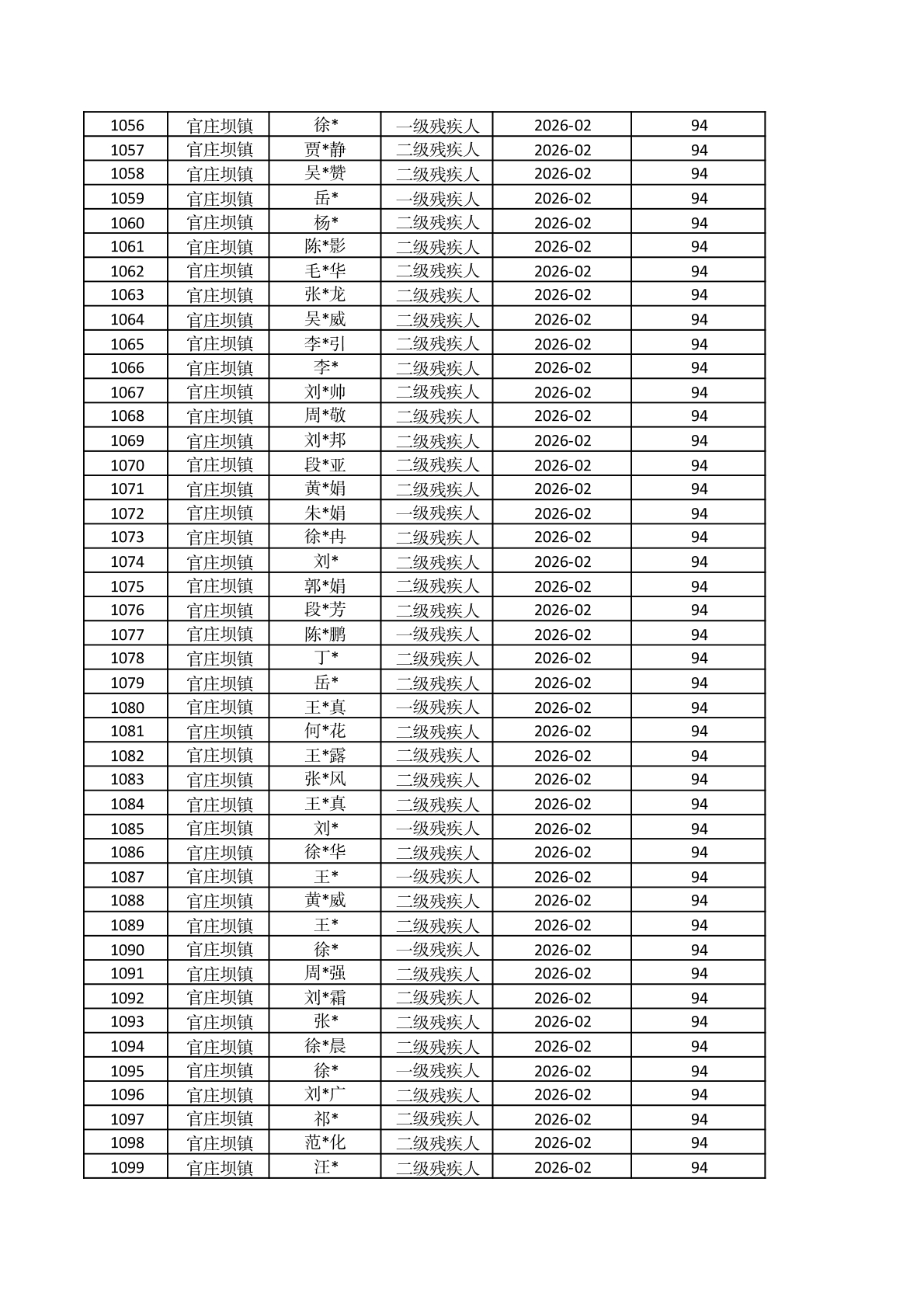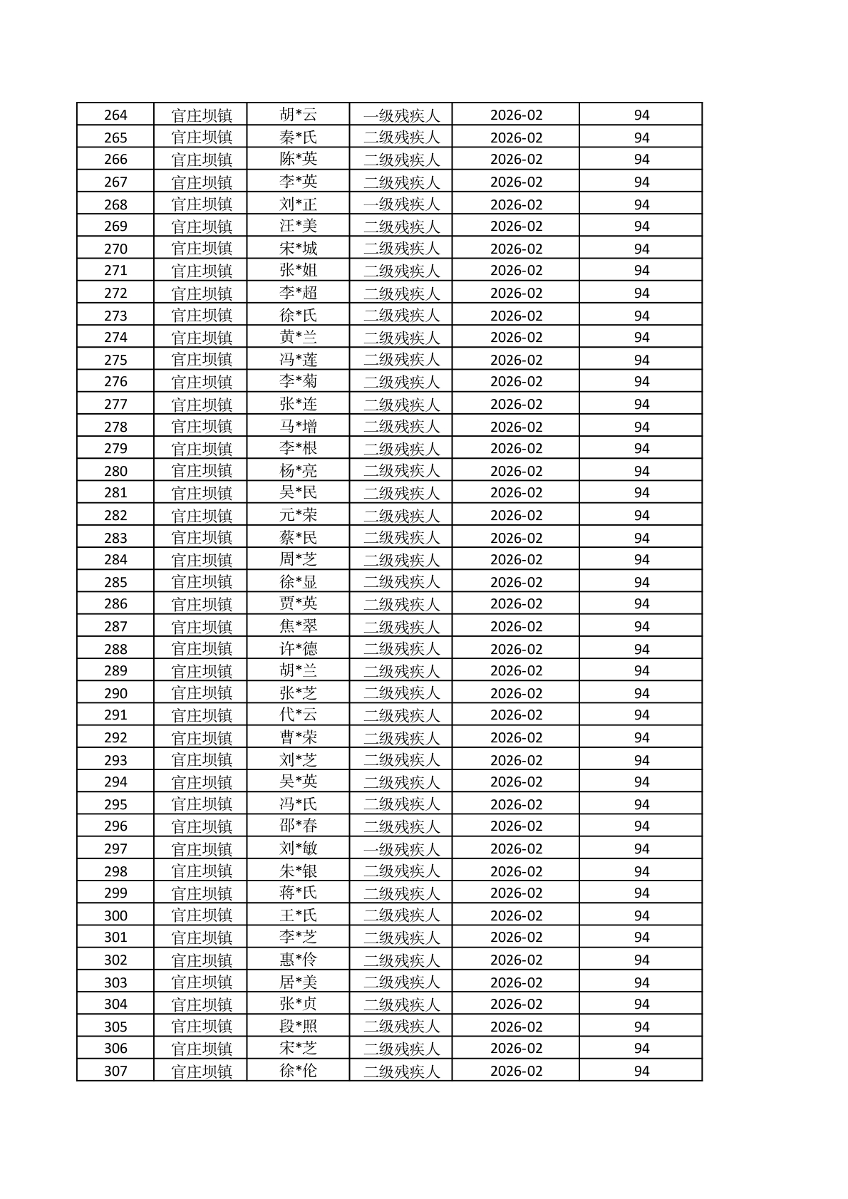 官庄坝镇2026年2月重度残疾人护理补贴资金发放花名册 |