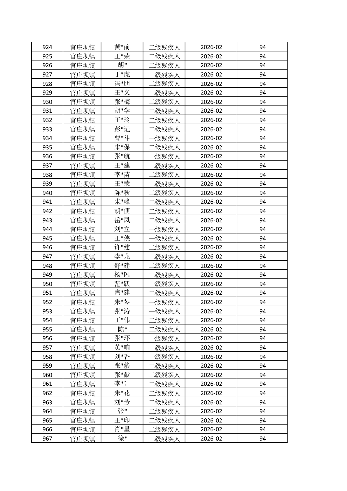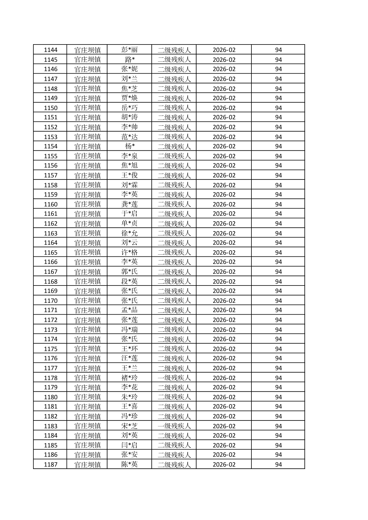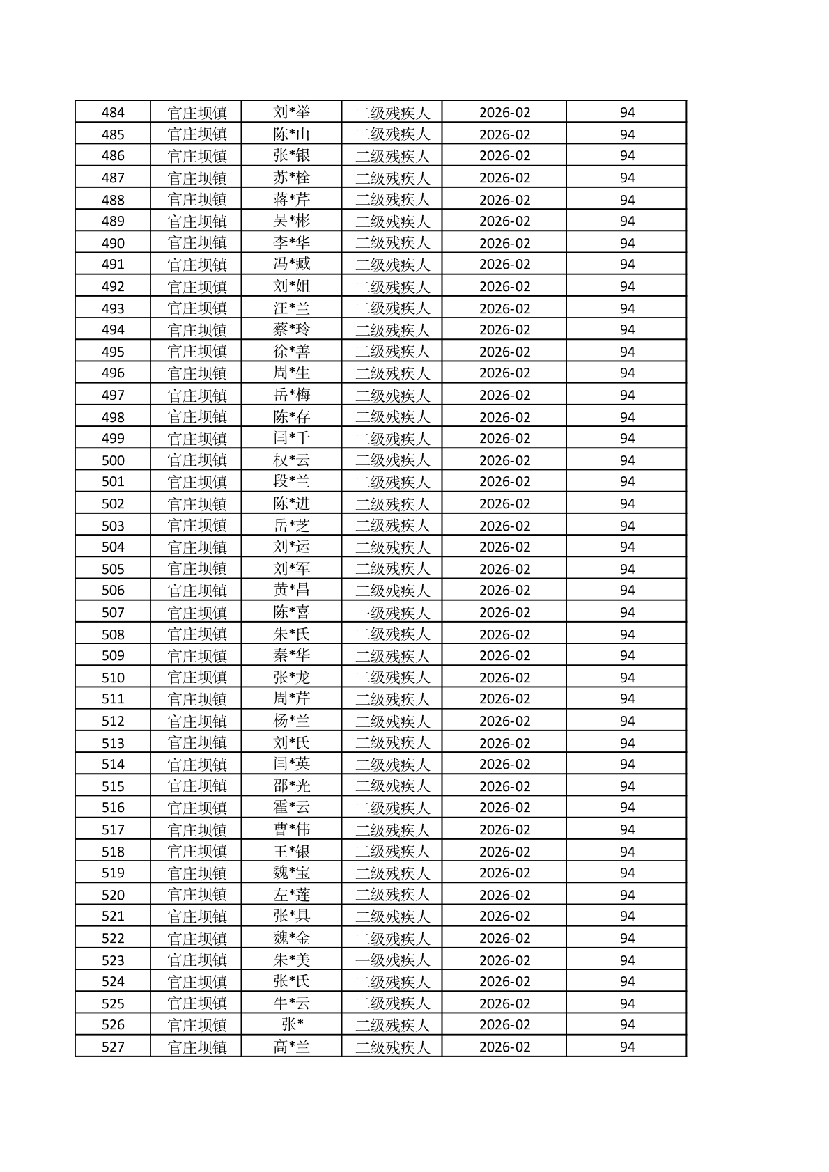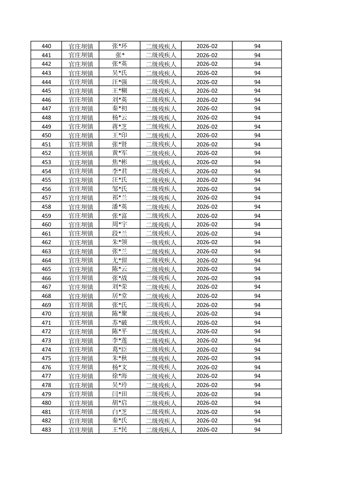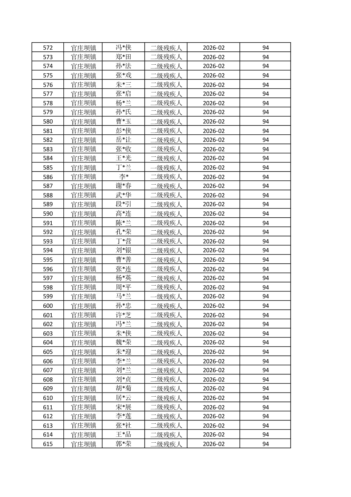 官庄坝镇2026年2月重度残疾人护理补贴资金发放花名册 |