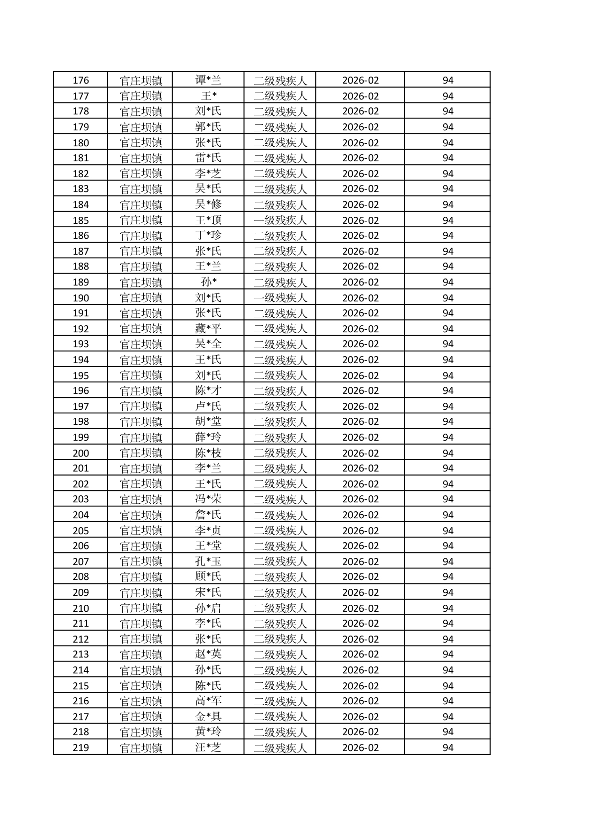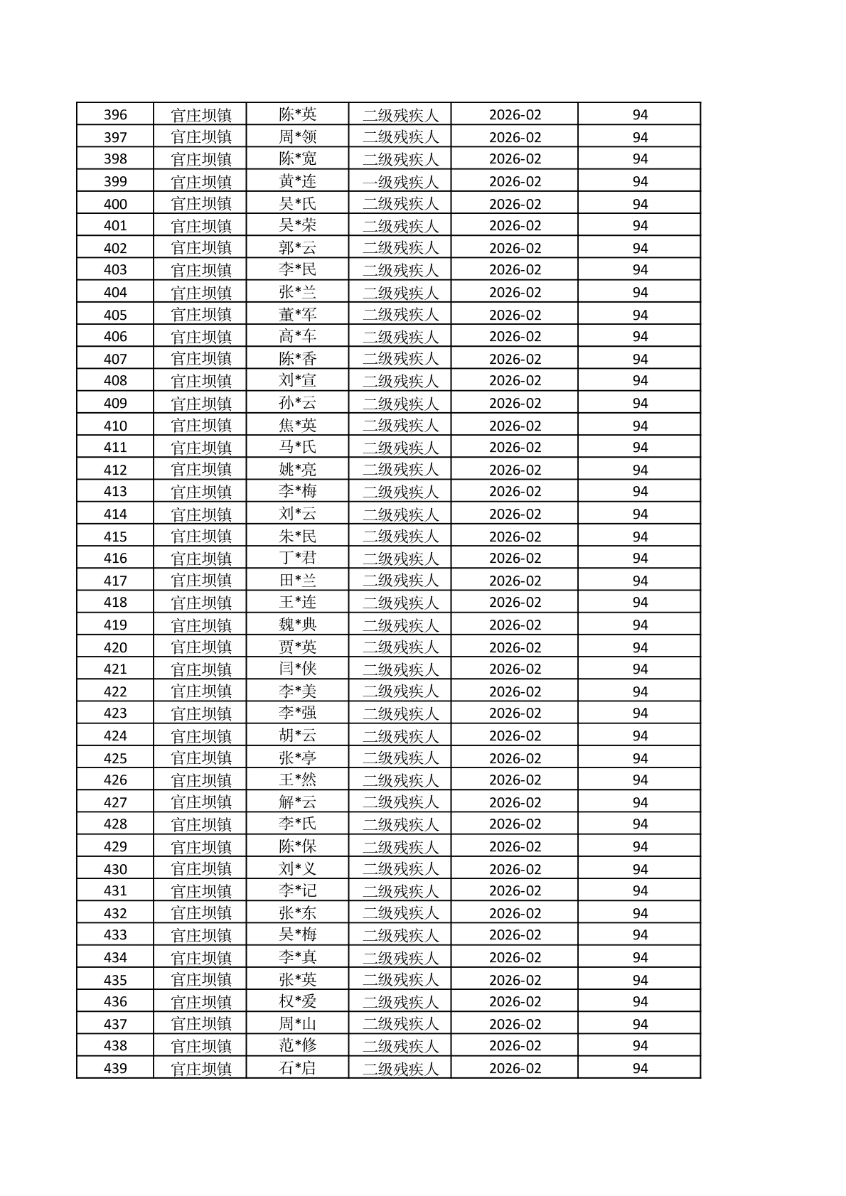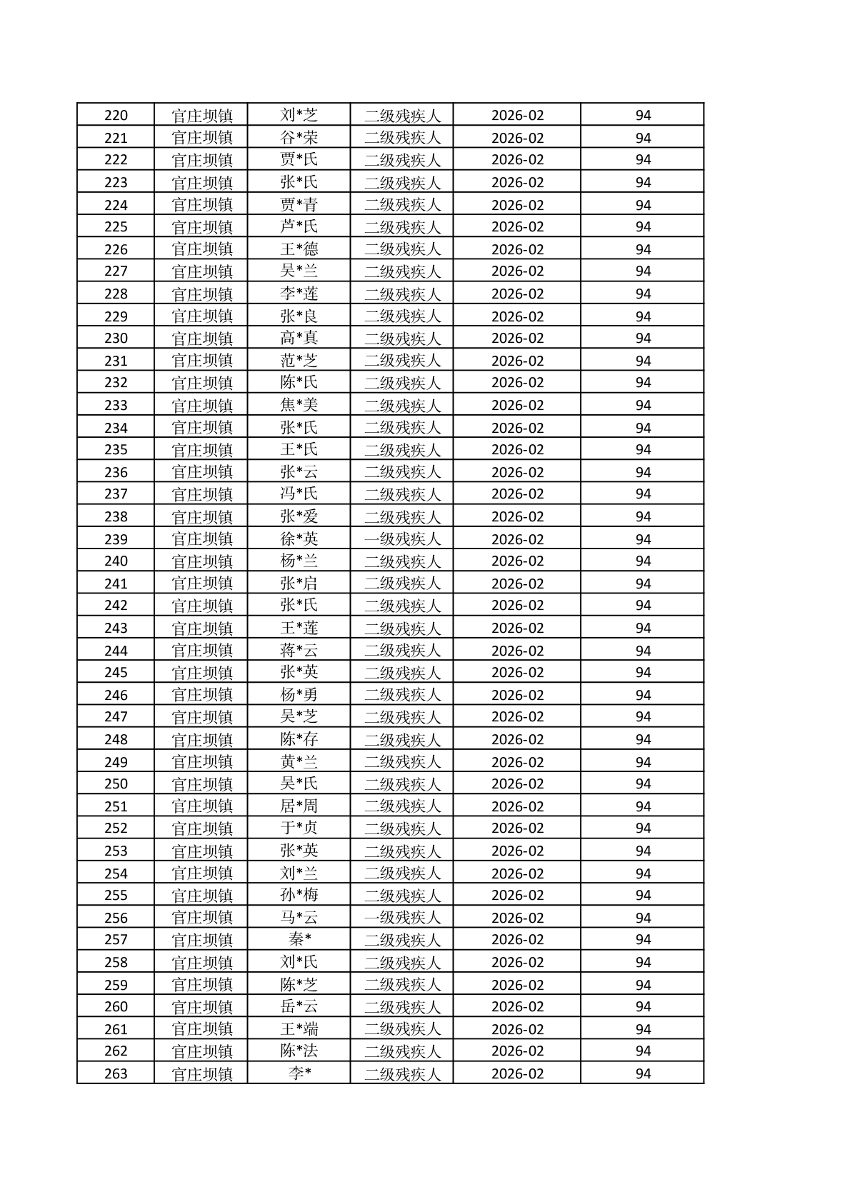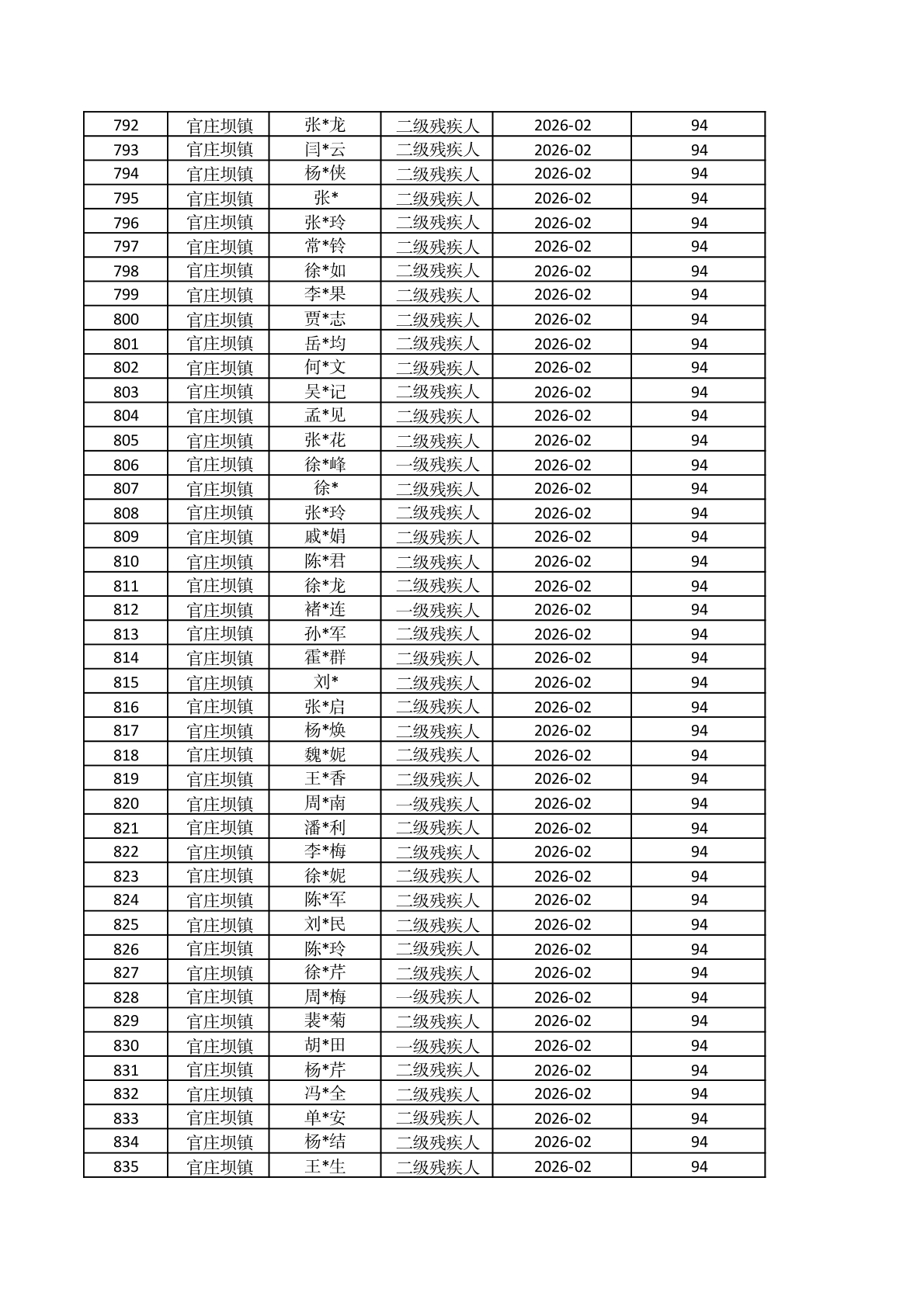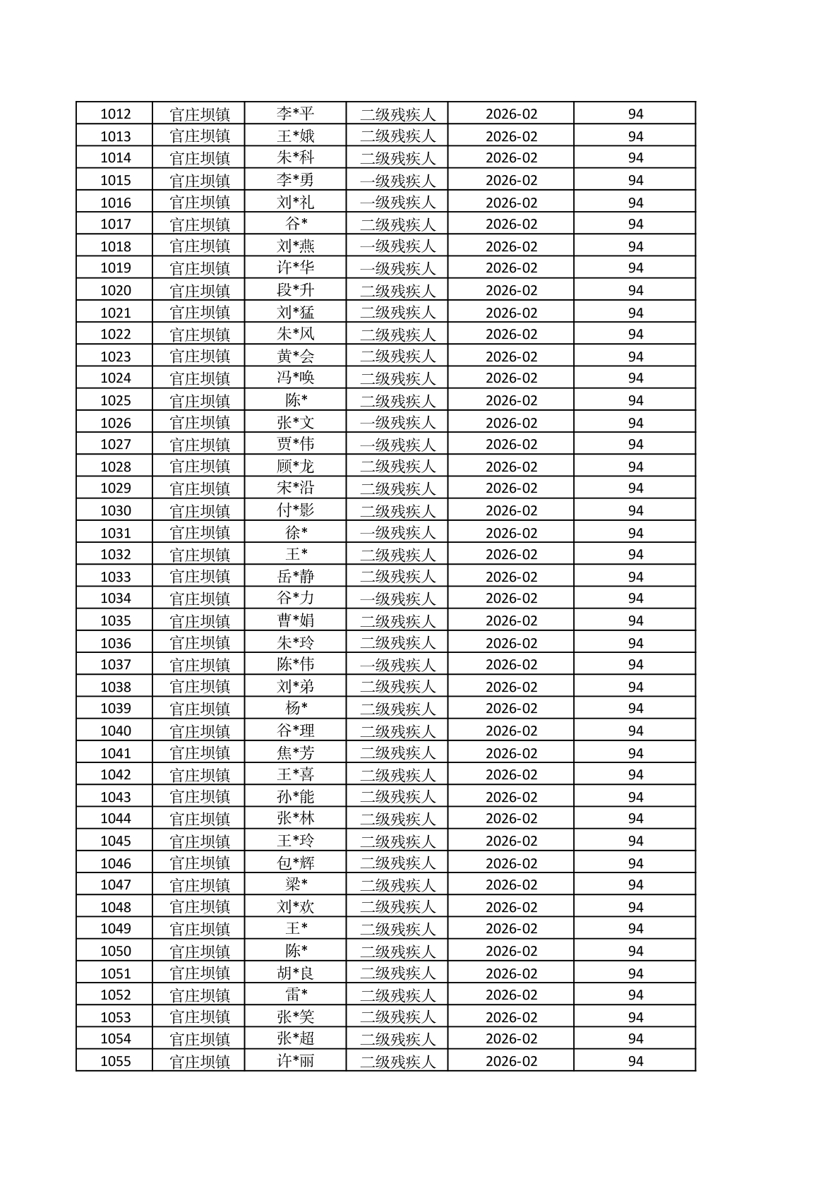 官庄坝镇2026年2月重度残疾人护理补贴资金发放花名册 |